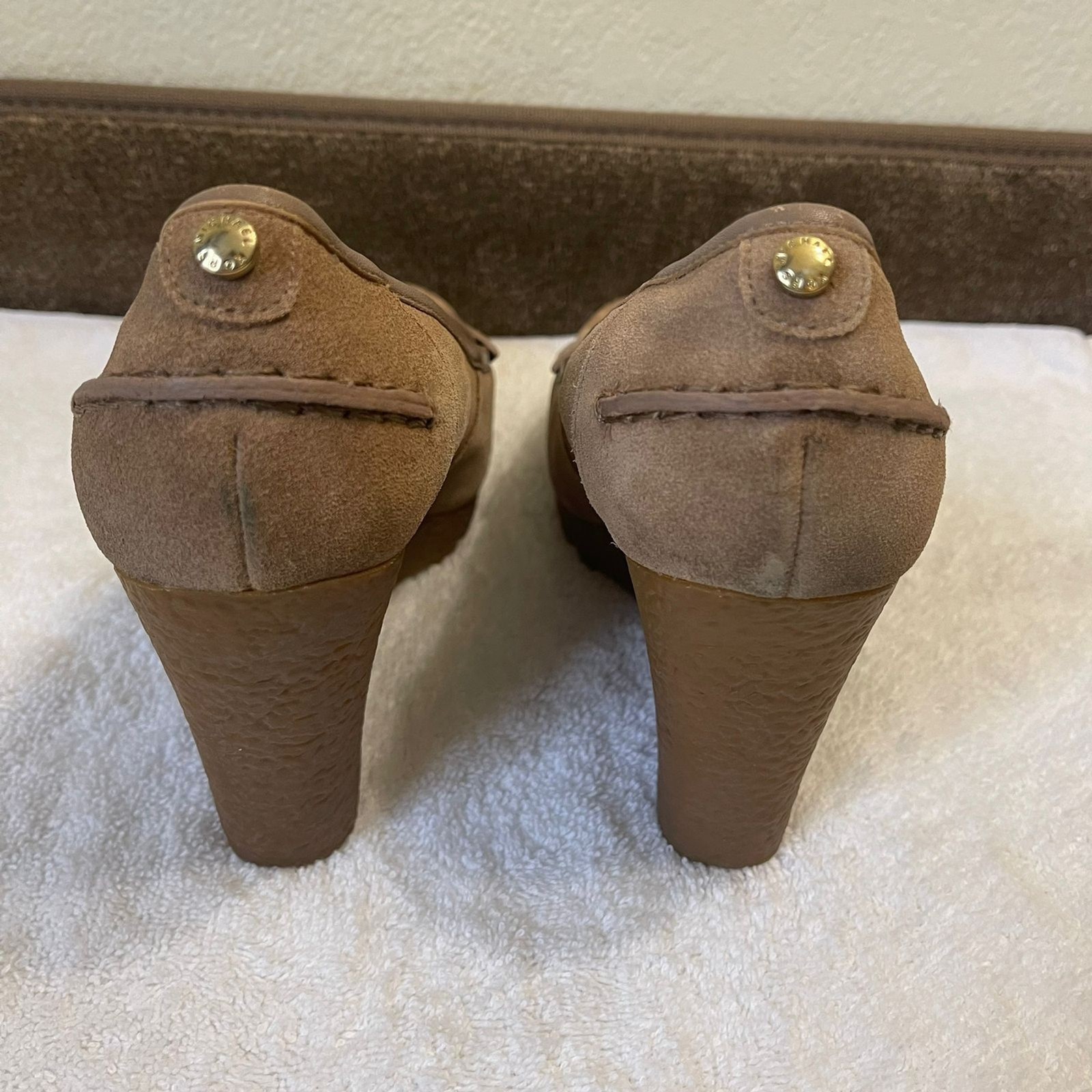 Upgrade your wardrobe with these stylish Michael Kors Women’s Leather High Heel Loafer Pump Wedges in Size 7. Made from premium genuine leather, these shoes combine the classic loafer look with the height and comfort of a wedge-style pump. Perfect for work, business casual outfits, or elevating everyday style. Condition: Pre-owned. Clean exterior, minimal normal wear on soles. No major flaws. Check Images. Color: Brown Material: Upper - Leather, Outsole - Rubber Size: Women’s 7 Style: Loafer Pump Wedge Features: Comfortable high wedge heel Slip-on loafer design MK designer quality Versatile for office, events, and daily wear Please see all photos for details. Smoke-free home. Fast shipping!