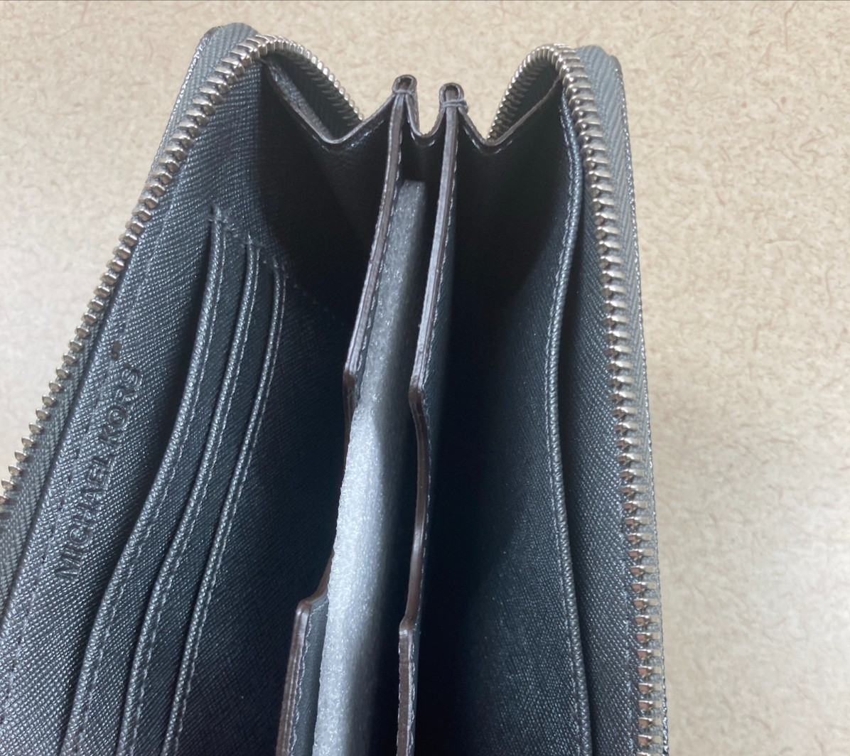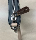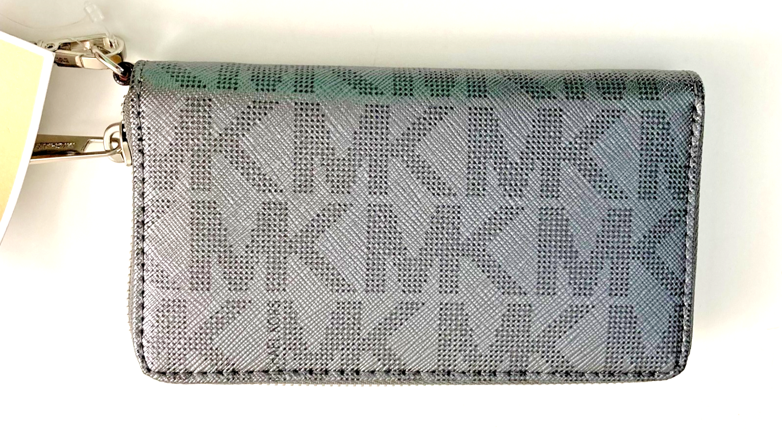 The Michael Kors Metallic Zip Around Organizer Wallet is a stylish and practical accessory for women. Made of leather with a silver color and logo accents, this wallet features a zip-around closure and multiple credit card slots for organization. The sleek design and metal theme make it a versatile piece to complement any outfit.