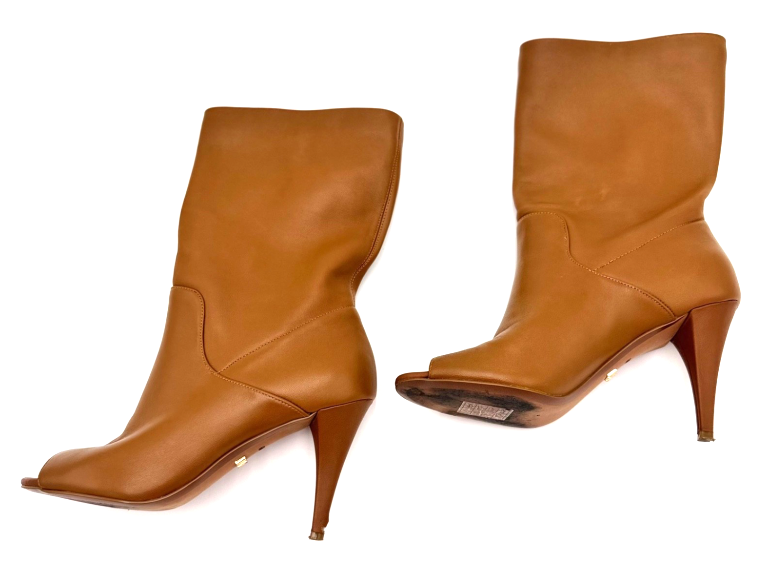 Michael Kors Open Toe Brown Leather Peep Mid Calf Boots Size 6M Women’s Good These Michael Kors mid-calf peep-toe boots bring designer elegance to any outfit. Crafted in rich brown leather with a sleek silhouette, they are versatile for both casual and dressy looks. Please note: they show wear on the soles and heel tips, as pictured. Item Specifications: Brand: Michael Kors Size: Women’s US 6M Style: Mid-calf, open peep-toe boots Color: Caramel / Brown Heel height: Approx. 3.5 in Material: Leather upper, synthetic sole Features: Designer Michael Kors logo detail Elegant mid-calf silhouette Chic peep-toe design Leather construction Condition Pre-owned, with visible signs of wear. Heel tips are worn down and may require replacement. Soles show scuffing and wear. Leather upper remains in good condition, no major flaws. Sold as is, please review photos carefully. Picture in this listing correspond to the product you are getting. We shoot them in our studio, please see the pictures for more details and allow some differences in color because of the light we use in our studio. At Gianna Clare Store we care 100% about your satisfaction. If you encounter any issues or if something doesn't meet your expectations, we kindly ask you to contact us through the " Ebay - Ask Seller A Question " before leaving negative feedback. We are committed to resolving any problems as quickly as possible and ensuring you have a positive experience with us. Your feedback is very important to us, and we will do everything we can to assist you. Shipping: We ship Monday to Friday. Returns: Please read the item description before buying. We only accept returns if the product doesn't correspond to the description. If yours, is a special case please contact us beforehand so we can give you an appropriate solution. Thank you for shopping and trusting us!