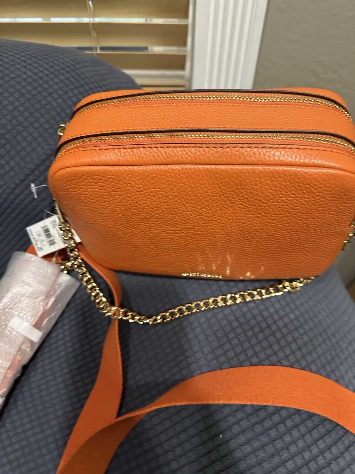 The Michael Kors Orange Leather Crossbody Bag with Chain Strap is a stylish and spacious accessory for women. Made from high-quality leather and featuring a gold metallic chain strap, this rectangular-shaped bag exudes luxury and sophistication. With a zip closure, fabric lining, and subtle brand accents, this large-sized bag is perfect for carrying essentials while on the go. The burnt orange exterior color adds a pop of vibrancy to any outfit, making it a versatile and chic choice for everyday use.