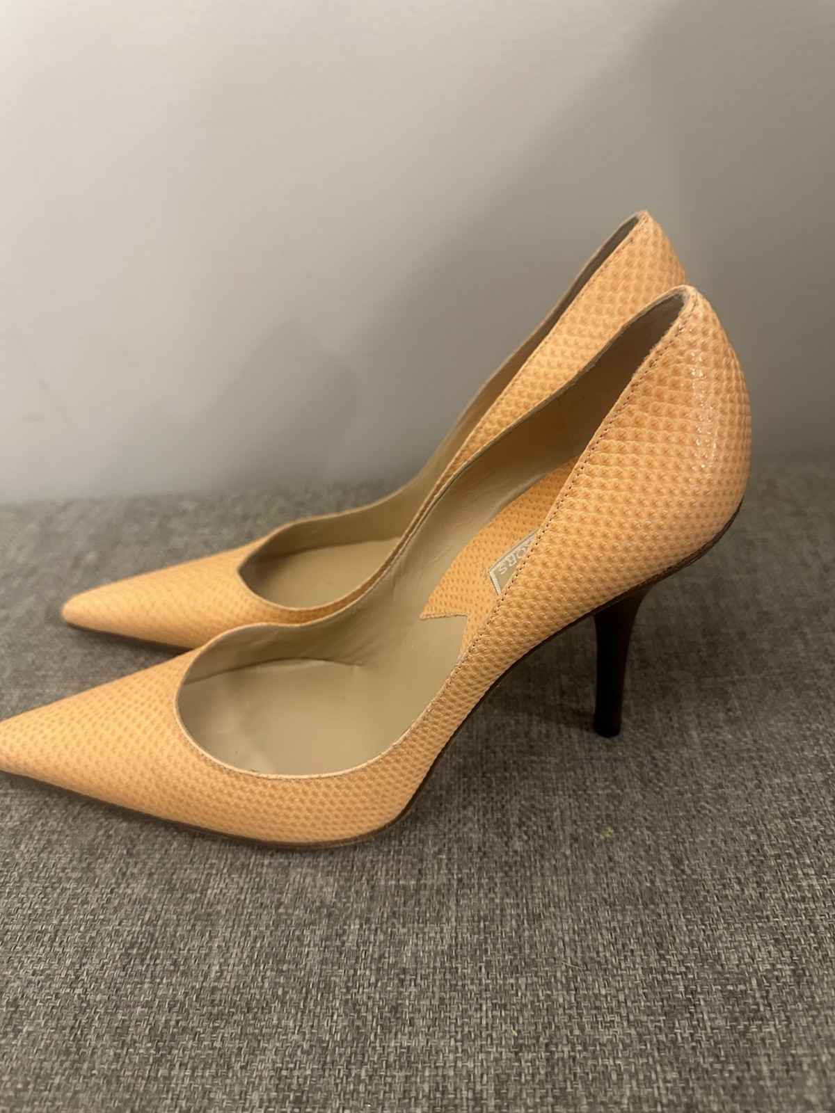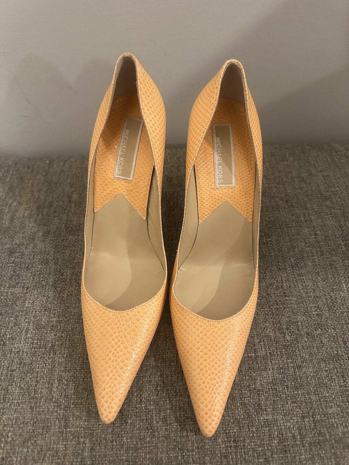 These Michael Kors Orange Snakeskin Stilettos in size 7.5 are a stylish and glamorous addition to any woman's shoe collection. Featuring a pointed toe, slip-on closure, and ultra-high stiletto heel, these pumps offer both comfort and elegance. The vibrant orange color and animal print pattern add a bold touch to the design, making them perfect for a night out or special occasion. Crafted from leather with a stiletto heel, these Michael Kors shoes are sure to make a statement wherever you go. Preowned Good Condition
