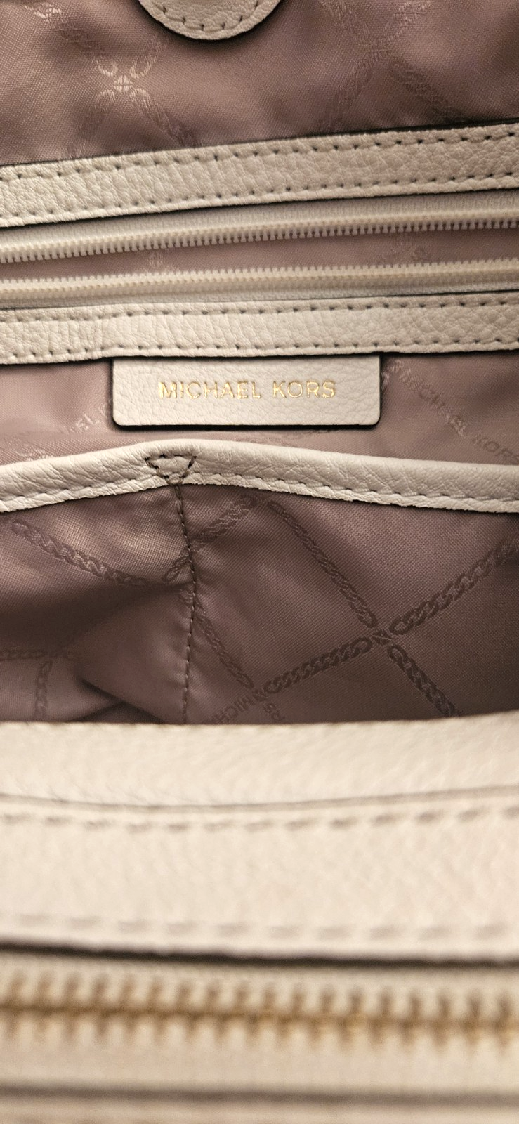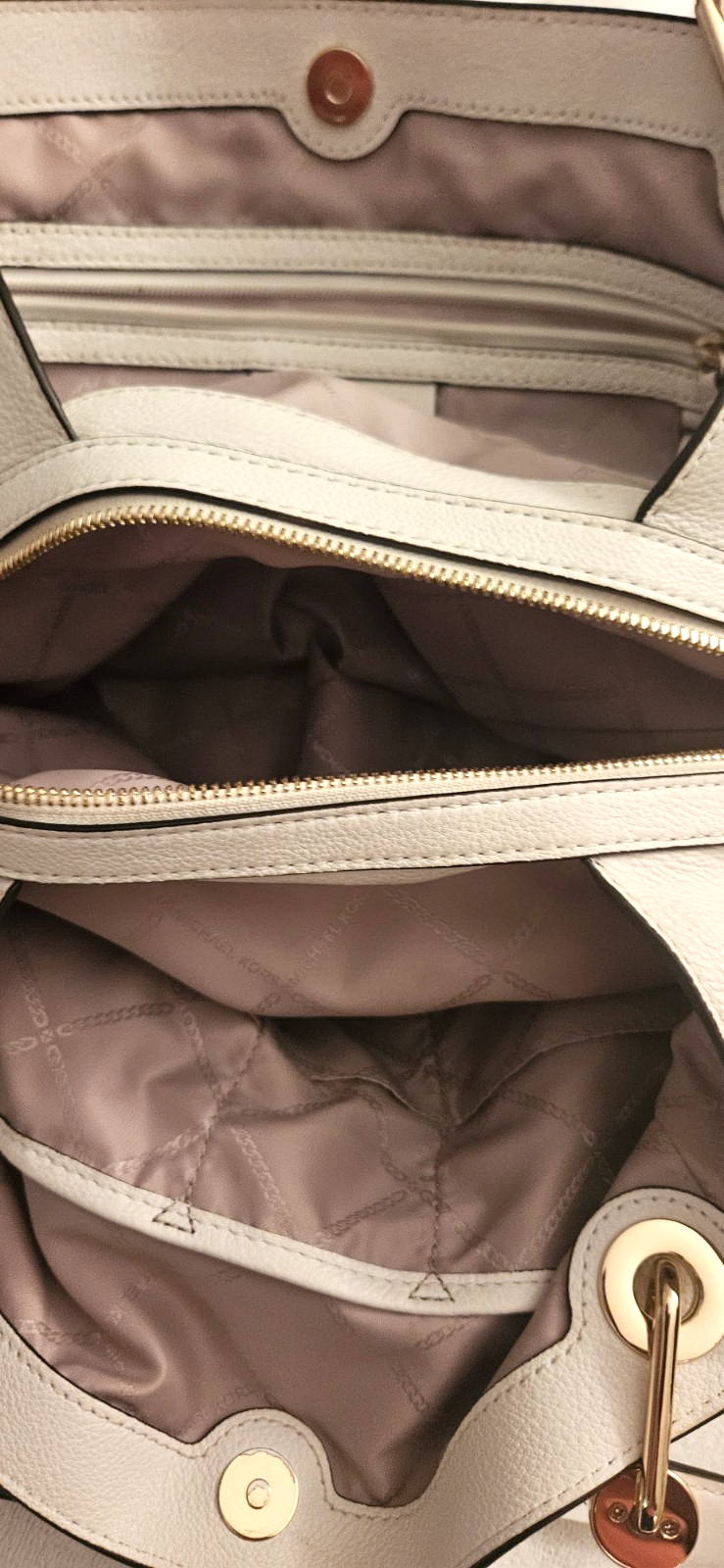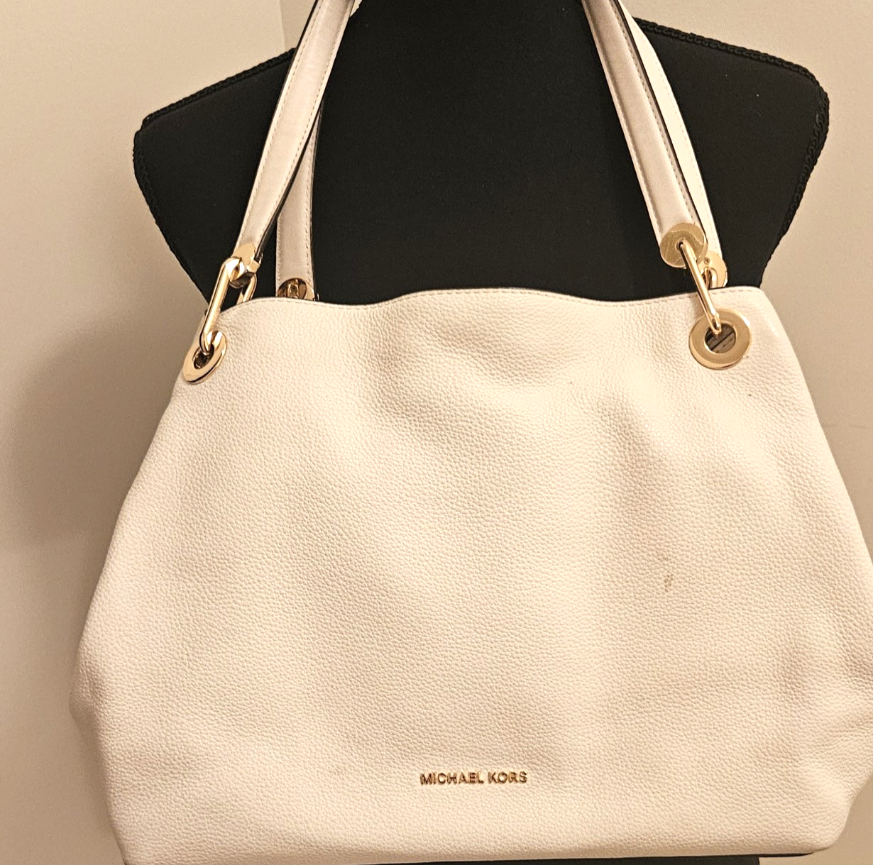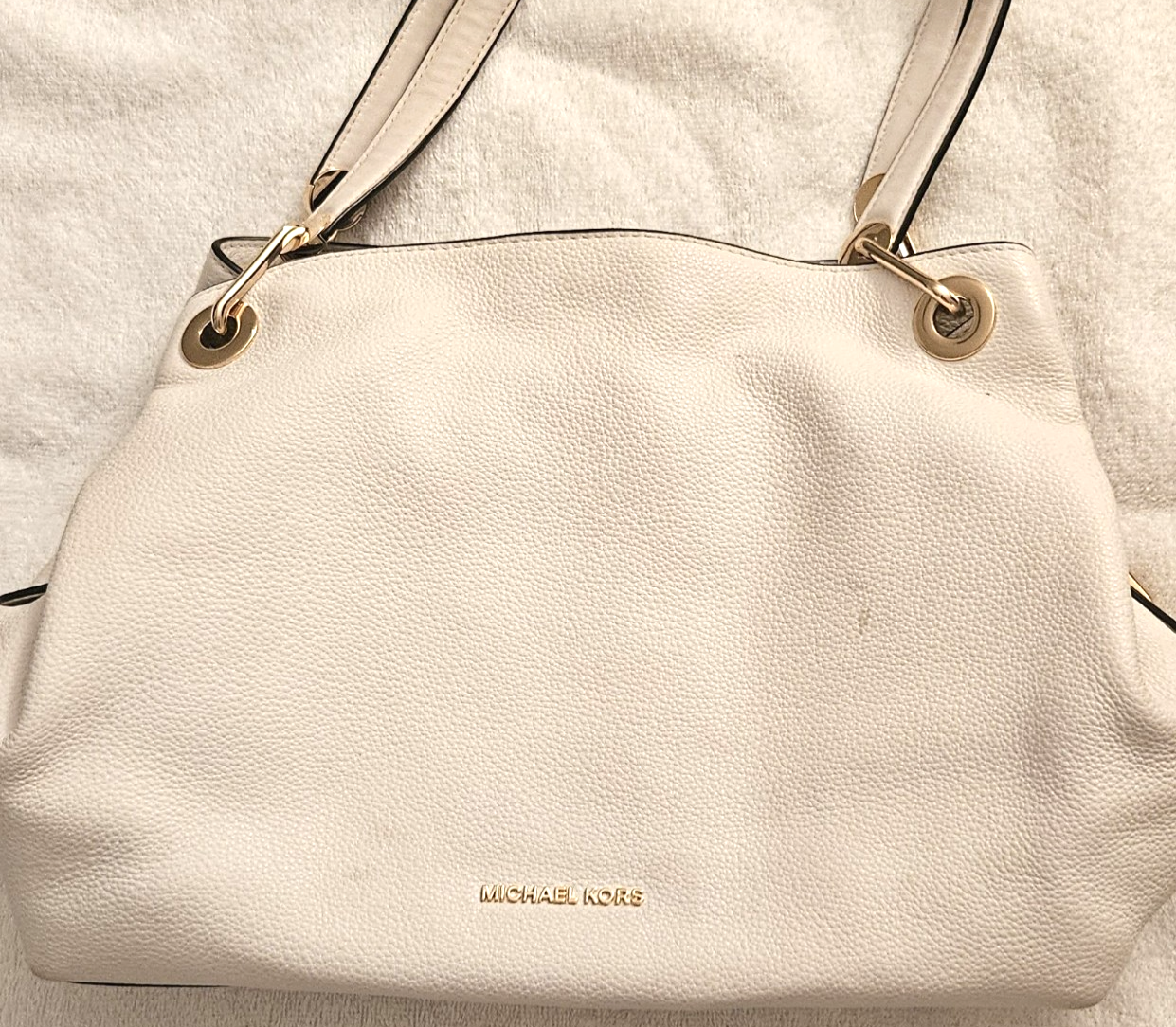 Michael Kors Womans Pebbled Leather Shoulder Handbag Double Strap Off White small spot of front of the bag
