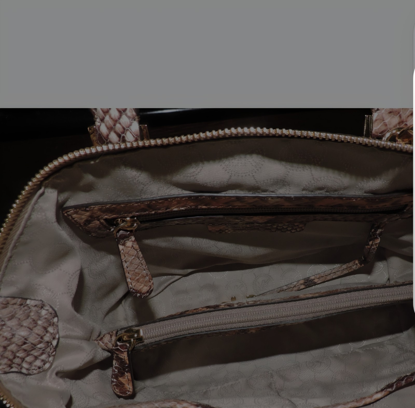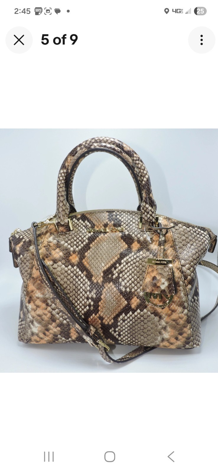 The Michael Kors Python Snakeskin Crossbody Bag Shoulder Purse is a stylish and trendy accessory perfect for women on the go. Featuring a rectangular shape with a zip closure and a crossbody strap handle style, it is made of luxurious leather with animal print detailing, specifically showcasing a python snakeskin pattern in a brown exterior color with gold hardware accents. The medium-sized bag also includes inner pockets for organization, making it both fashionable and functional for everyday use. This designer piece is part of the Michael Kors Python product line, adding a touch of sophistication to any outfit.