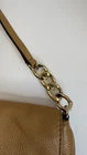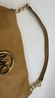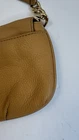 Authentic Michael Kors shoulder bag in tan pebbled leather with gold-tone MK logo and chain handle. • Size approx: 11” x 6” (28 x 15 cm) • Magnetic snap closure • Interior: one zip pocket, one open pocket • Lining: beige MK logo fabric (shows visible marks and discoloration, but not torn) • Exterior: one small pen mark on front, light creasing from use • Smell: noticeable cigarette odor Sold as is. May need cleaning inside.