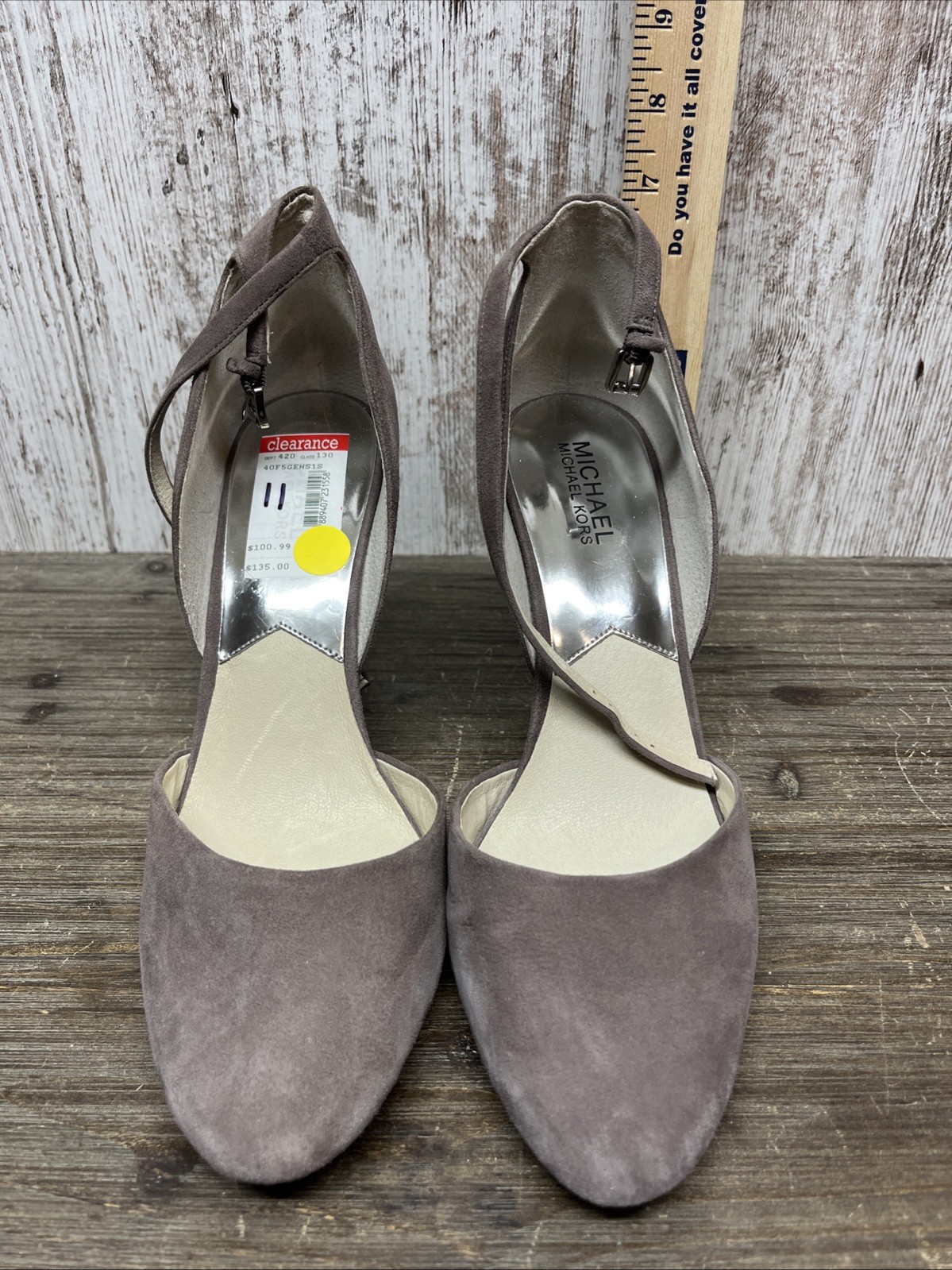 The Michael Kors Size 11M heels are a stylish and versatile choice for any party or cocktail event. Made with high-quality leather in a luxurious greyish/brown color, these stiletto heels feature a classic pump style with a comfortable leather lining. Perfect for adding a touch of elegance to your summer or spring wardrobe, these shoes are a must-have for any fashion-forward woman. With the iconic Michael Kors branding and a solid pattern, these heels are sure to make a statement wherever you wear them.