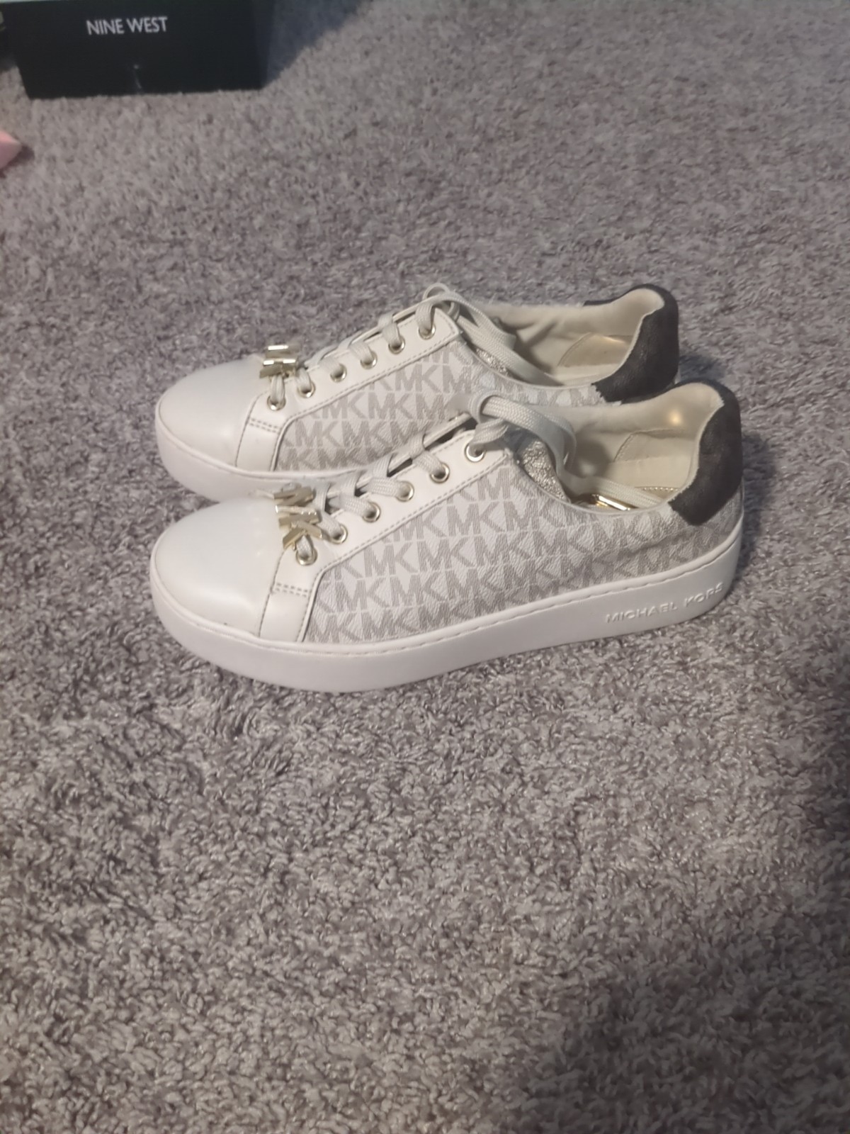 The product is a pair of Michael Kors women's sneakers in size 7, featuring a white and brown colorway with a low top shaft style and lace-up closure. Made of leather with a rubber outsole, these athletic shoes are perfect for casual occasions and walking activities during the summer, fall, and spring seasons. The Michael Kors logo accents add a touch of style to these versatile sneakers, making them a fashionable and practical choice for everyday wear. barely worn