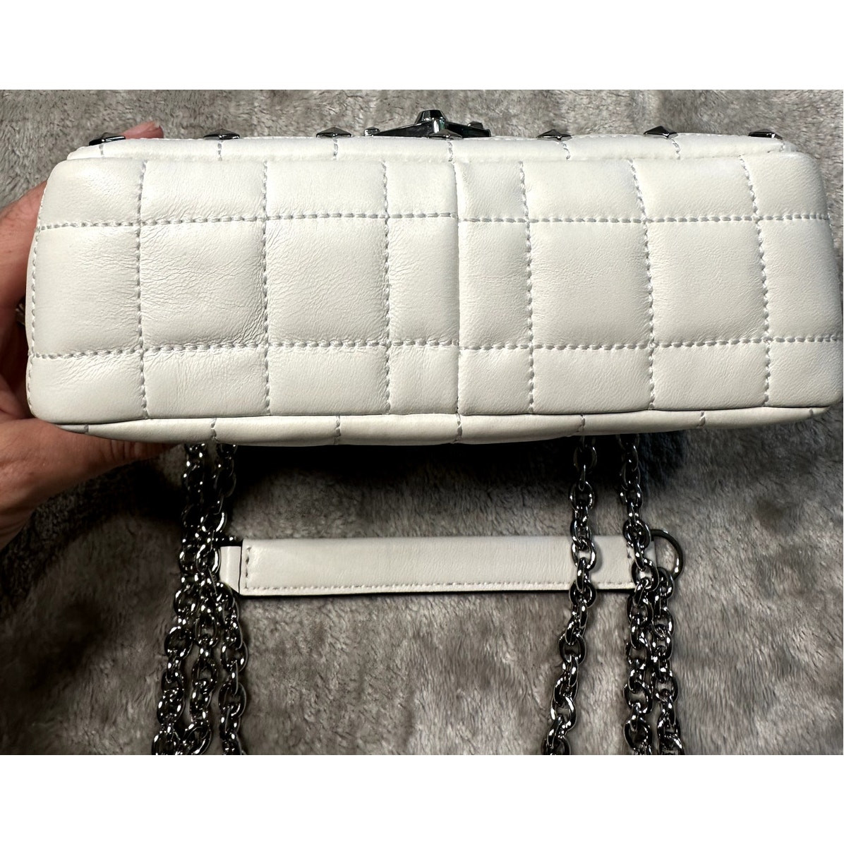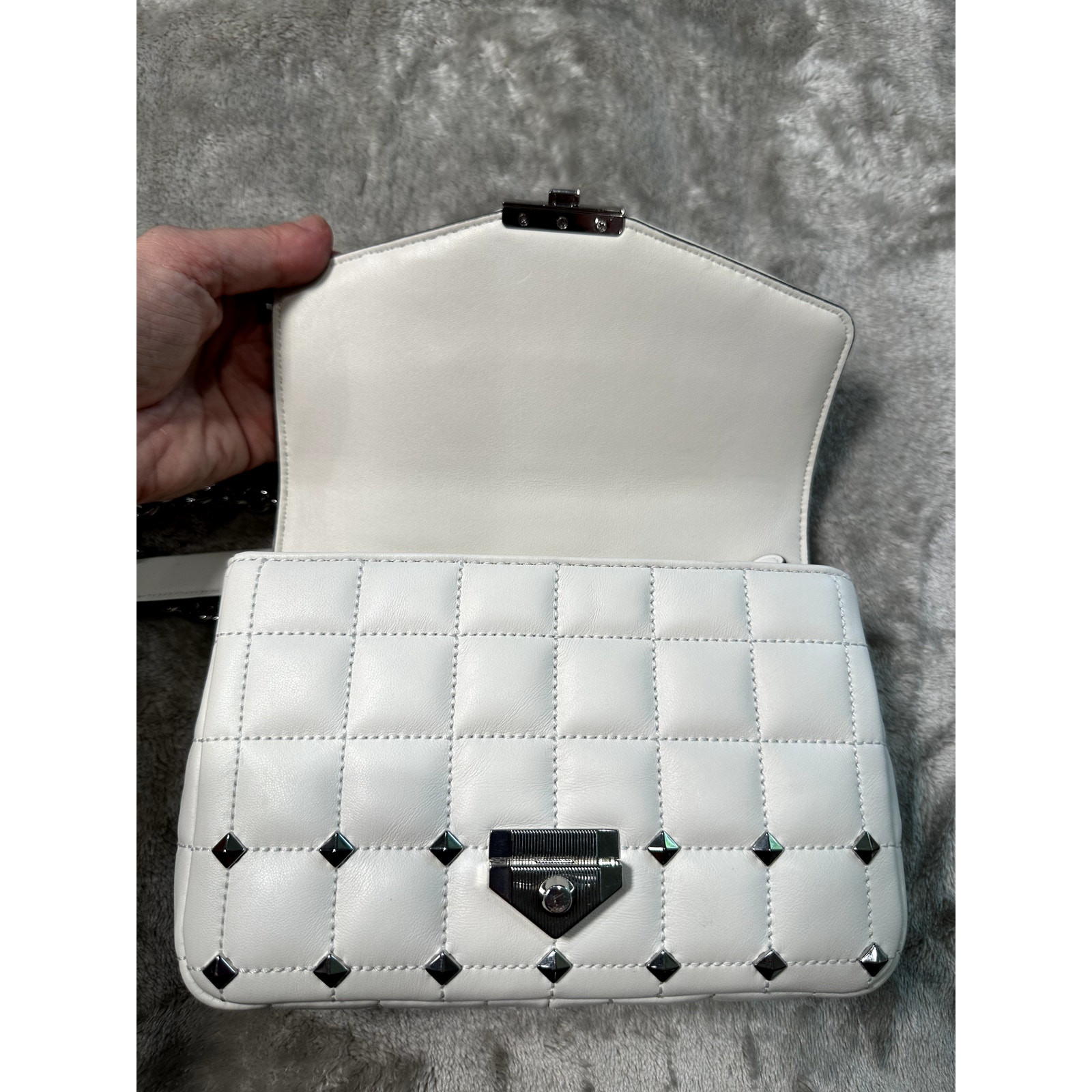 This stylish bag is a must-have! The white quilted leather looks elegant, and the silver studs add a chic edge. The adjustable chain strap makes it versatile for any occasion, while the multiple pockets keep essentials organized. Lightweight yet spacious, it’s perfect for daily use or nights out. The push-lock closure feels secure, and the hardware gives it a luxurious finish. Arrived quickly and in great condition—absolutely love it!