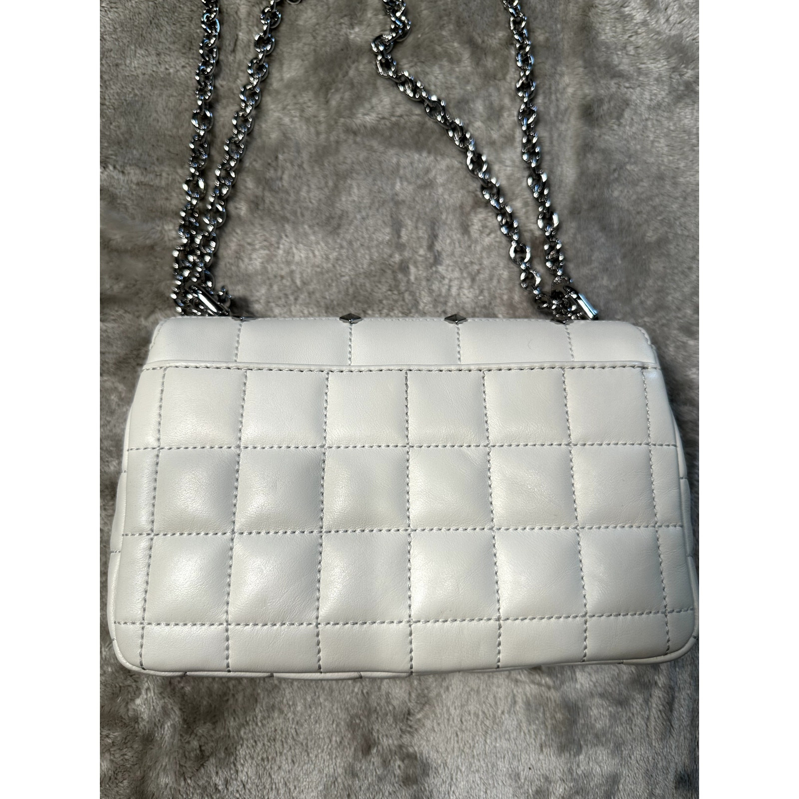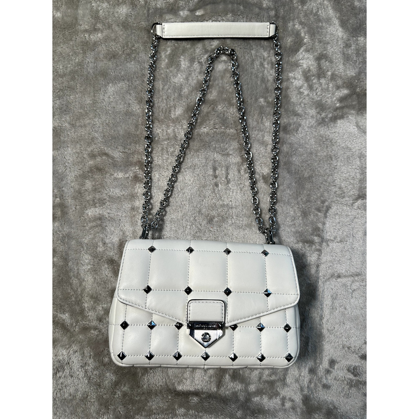 Michael Kors SoHo White Leather Quilted Chain Silver Studded Shoulder Bag Excellent condition - see pictures for wear and measurements. 8-1/2"W x 5-1/2"H x 3"D (width is measured across the bottom of handbag); 11"L - 20"L adjustable strap Push-lock closure Silver-tone exterior hardware, 1 back slip pocket & logo 1 interior zip pocket, 1 slip pocket & 1 center zip compartment Smoke-free environment Orders ship within one business day.