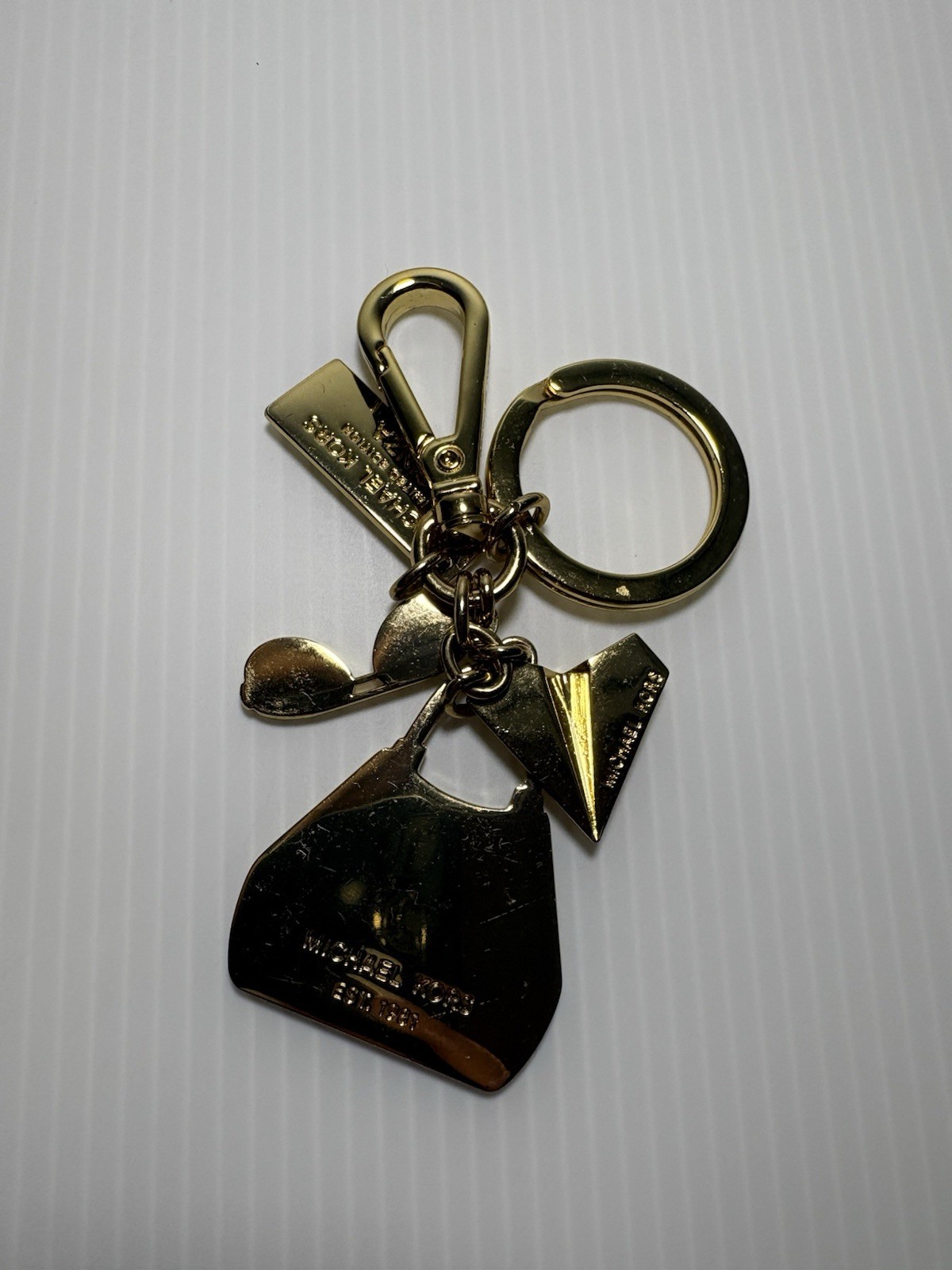 Add a touch of chic, collectible Michael Kors style to your keys, bag, or wallet with this beautiful multi‑charm keychain. This piece features a polished gold‑tone keyring with four signature charms: a pink handbag, glittery sunglasses, a gold paper airplane, and a rectangular tag engraved “MICHAEL KORS TOKYO JAPAN GINZA.” A stylish and hard‑to‑find accessory, perfect for MK lovers and collectors. Features: • Authentic Michael Kors keychain • Gold‑tone hardware with lobster clasp • Pink handbag charm • Glitter sunglasses charm • Gold paper airplane charm • Engraved MK Tokyo Ginza tag • Great for keys, totes, backpacks, or as a bag charm • Rare design, boutique-style piece Excellent condition