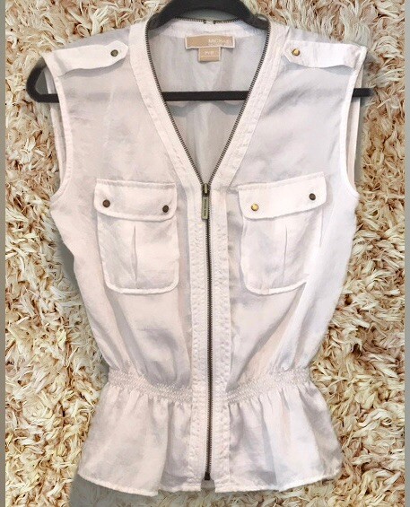 Michael Kors White Sleeveless Peplum Full Zip Blouse XS. Michael Kors White Sleeveless Peplum Full Zip Blouse XS MK sexy sleeveless blouse can be worn zipped as high or as low as you want to go! Between the silky smooth material & versatile cream color, this top can go with anything. •full zip detail goes all the way through & around neck •gold studded details •sleeveless top w/ gold tone accents & zipper •peplum style with gathered/cinched elastic waist •gorgeous shiny satin •100% poly •double snap pockets •logo zip + buttons •lightweight •length approx 23” •XS