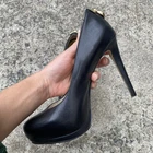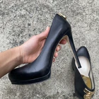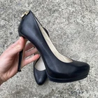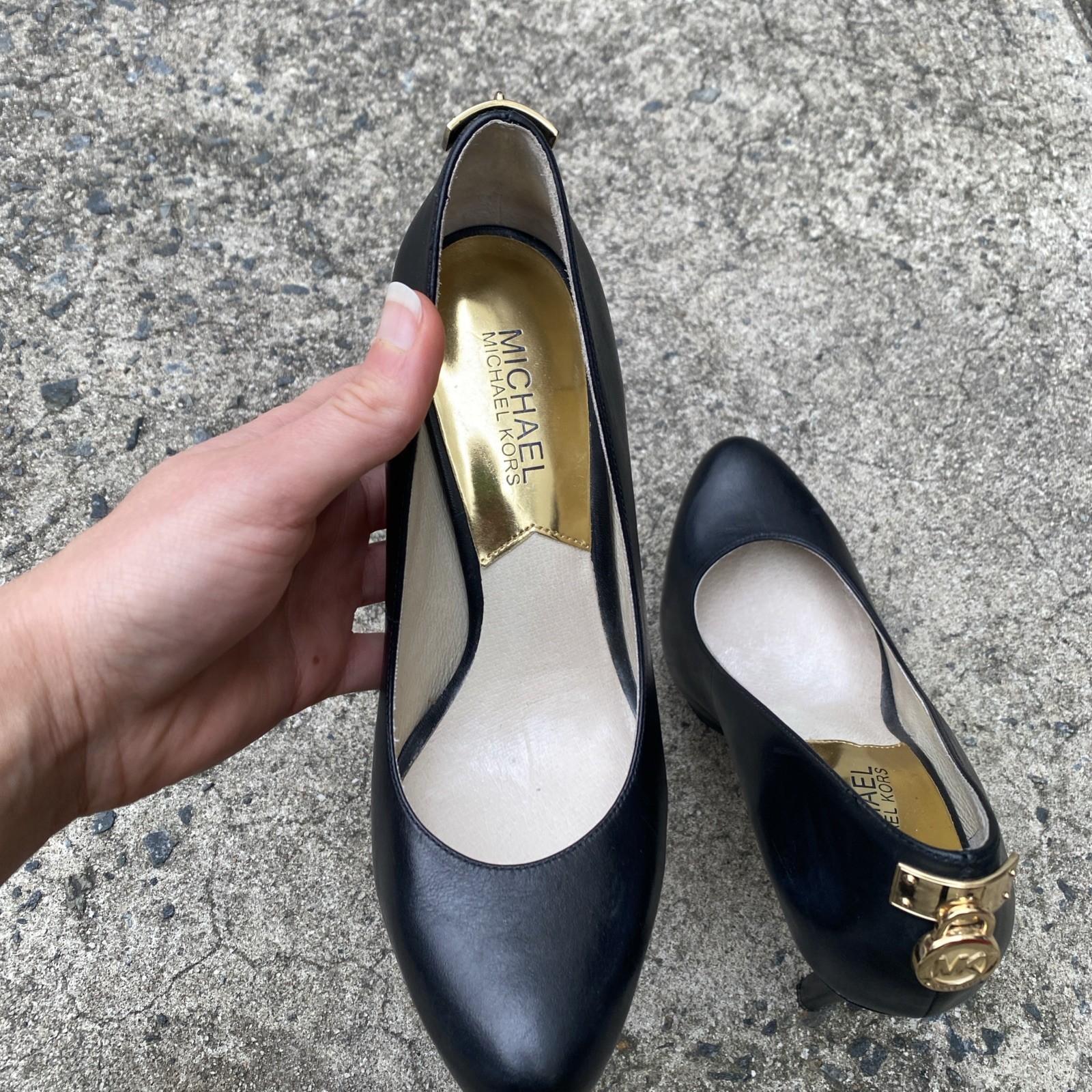 The Michael Kors Women's Hamilton Pump in size 6 is a stylish and elegant platform heel in black leather with gold accents. This slip-on pump features a round toe, ultra-high stiletto heel, and synthetic outsole. The leather lining and cushioned insole provide comfort and breathability, making it perfect for festive occasions or weddings. With the iconic Michael Kors branding and classic pump style, these shoes are a chic choice for any fashion-forward woman.