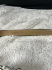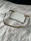 This Michael Kors Women's Signature Logo Belt Bag in White/Vanilla features a rectangular shape with a zip closure, gold hardware, and a vanilla synthetic leather exterior. It is a small-sized fanny pack with a wristlet accessory, designed for travel or casual occasions. The bag showcases the Michael Kors MK signature logo pattern, with a beige synthetic leather lining and a belt-style handle in vanilla synthetic leather.