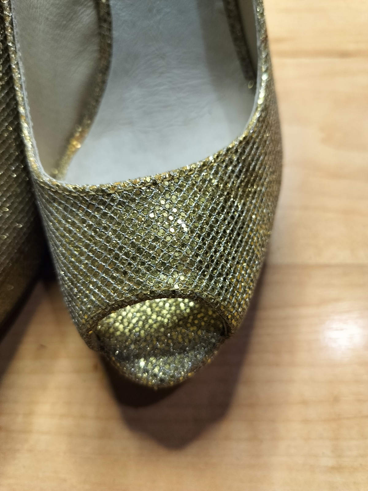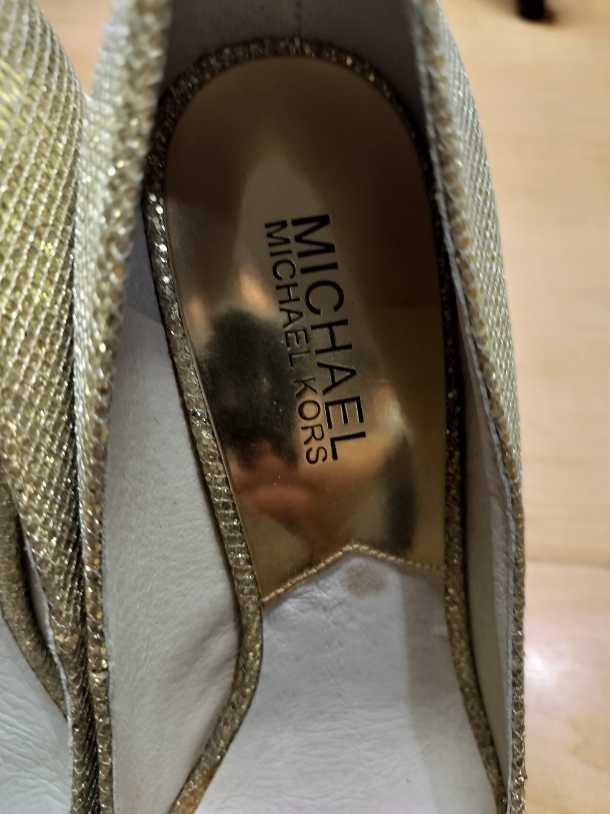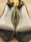 The Michael Kors York Glitter Peep Toe Glitter Gold Platform Heels in size 7M for women are a stylish and glamorous choice for any special occasion. These platform heels feature a stiletto heel and a peep toe design, with a synthetic upper material in a luxurious gold color. The combination of glitter and platform style adds a touch of sparkle and sophistication to any outfit, making them a desirable addition to any woman's shoe collection.