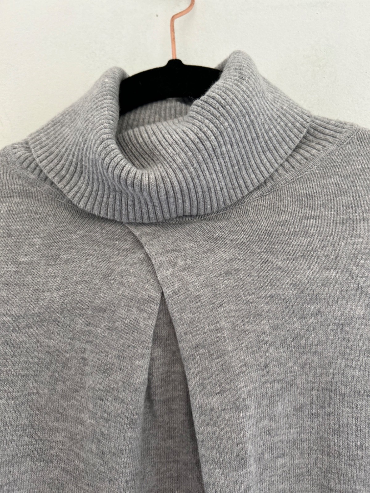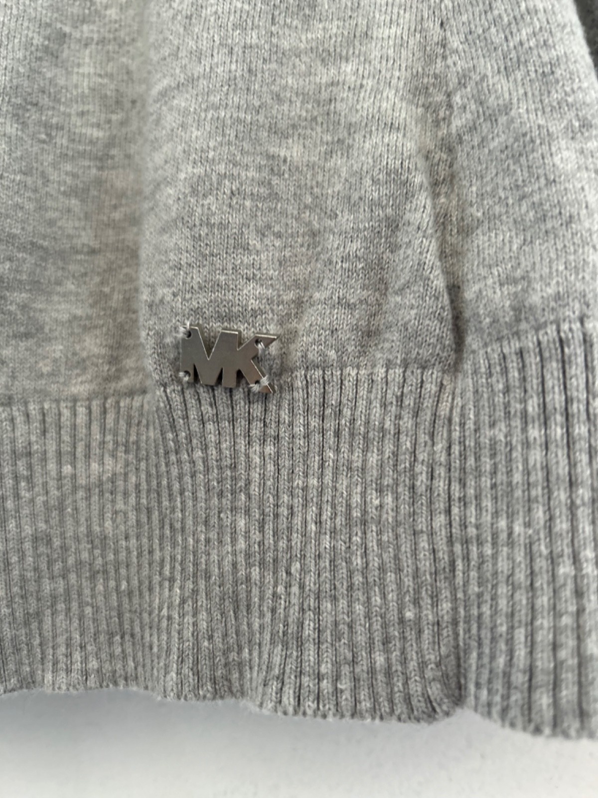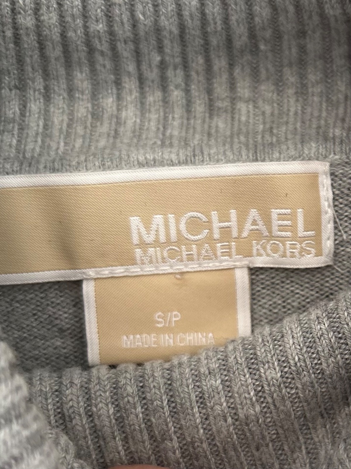 The product is a Michael Kors grey turtleneck sweater in size SP, designed specifically for petite women. Made from a comfortable cotton blend material, this classic pullover sweater features a stylish turtleneck neckline, ideal for everyday wear or dressing up. The sleek grey color adds versatility to the wardrobe, making it a timeless piece that can be easily paired with various bottoms for a chic and fashionable look.
