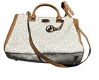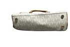 Seller Notes:“Bag is new / never being used”Department:WomenPattern:LogoExterior Color:WhiteSize:LargeHardware Color:GoldExterior Material:LeatherModel:Michael HamiltonStyle:ToteHandle/Strap Material:LeatherProduct Line:Michael Kors Signature BagLining Material:SatinLining Color:BrownBrand:MichaelHandle/Strap Color:Brown