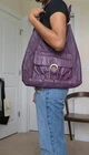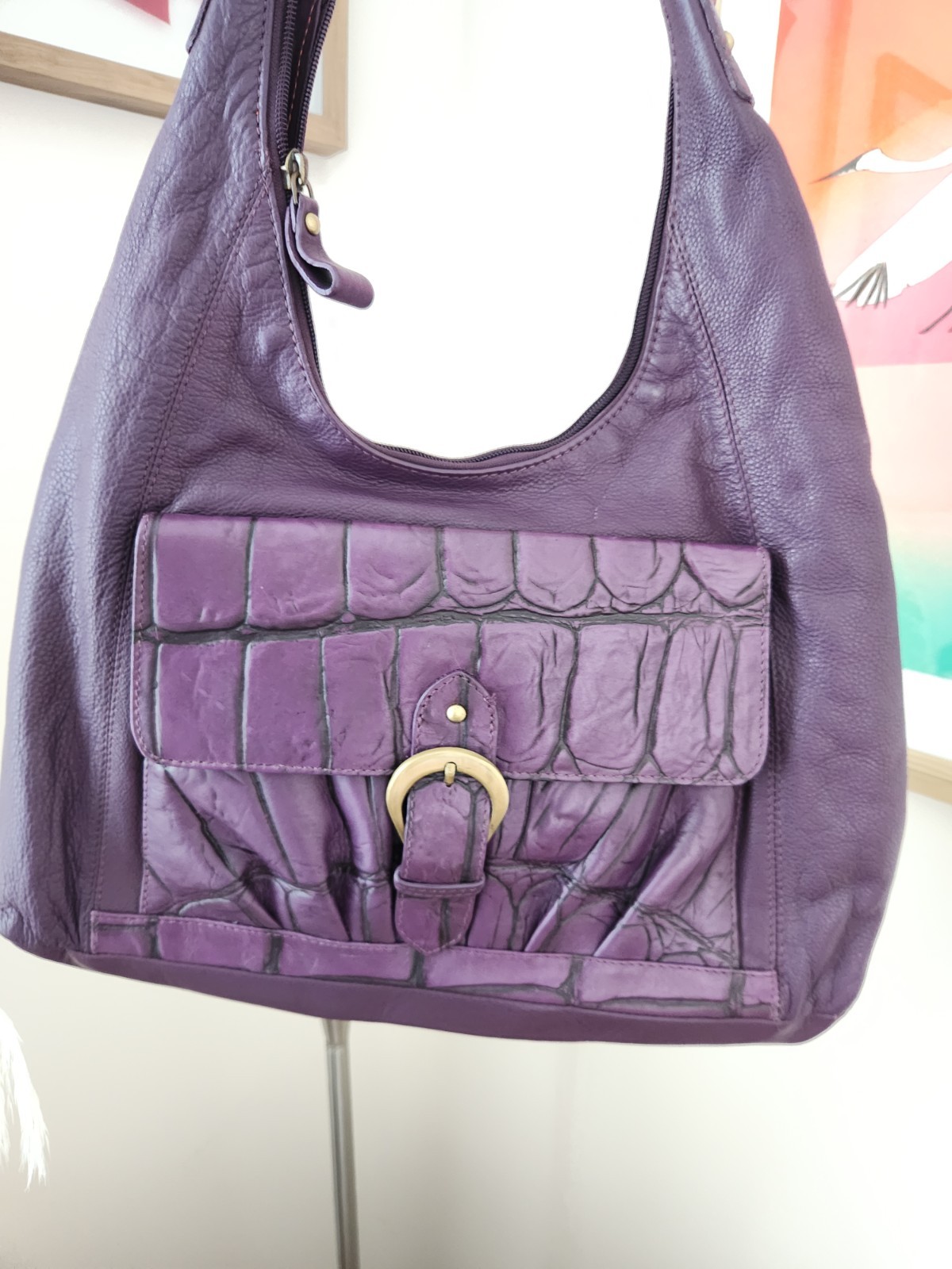 Vintage-inspired statement bag in rich purple genuine leather with a bold red interior. Features croc-embossed front pocket, gold buckle detail, and soft slouchy shape that feels straight out of an early 2000s mall window display. Made in Italy with quality craftsmanship and pop color energy that instantly levels up any outfit. Details Genuine leather Croc-embossed front pocket with buckle Zip top closure Gold-tone hardware Bright red logo lining Made in Italy Approx. Measurements (fill in your numbers) Height: 22.5 in Width: 15.5in Style Notes Y2K luxe, mallcore energy. Looks effortless with denim, a baby tee, or heeled boots.