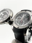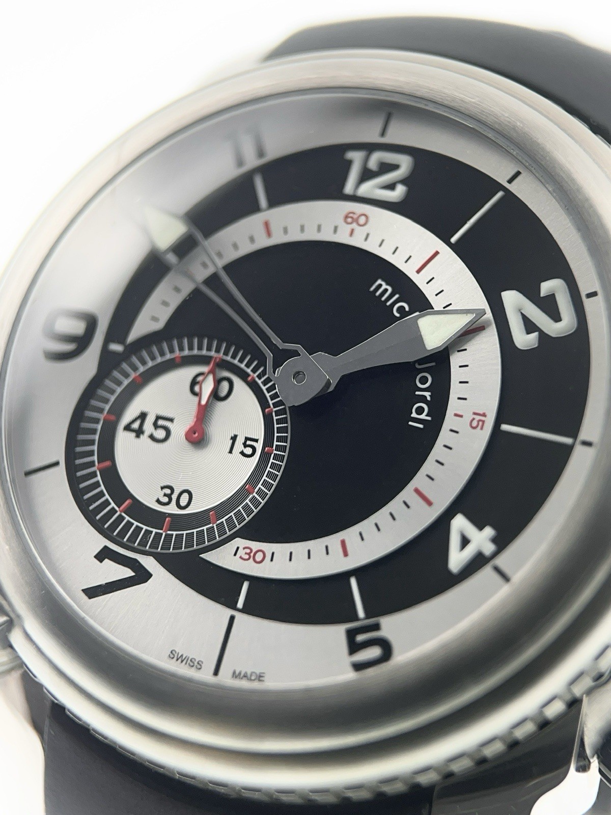 Michel Jordi Twins Titan Specs: -Fits up to 8.75-inch wrist -Automatic and manual wind movements -48mm -Black dial -Titanium Ref: Twins Titan Includes: Watch, double box, booklet, and international warranty card. Condition: The watch is in pre-owned condition. There are a few minor scratches on the case but nothing worth noting. The rubber strap is in lightly worn condition with lots of life left. Overall the watch is in nice shape. *We use a strong macro lens for our photos which may make imperfections appear larger or worse than they actually are. Polishing is available at an additional cost for our used steel and precious metal watches. International shipping is available, duties are the responsibility of the buyer. Please feel free to reach out with any questions.