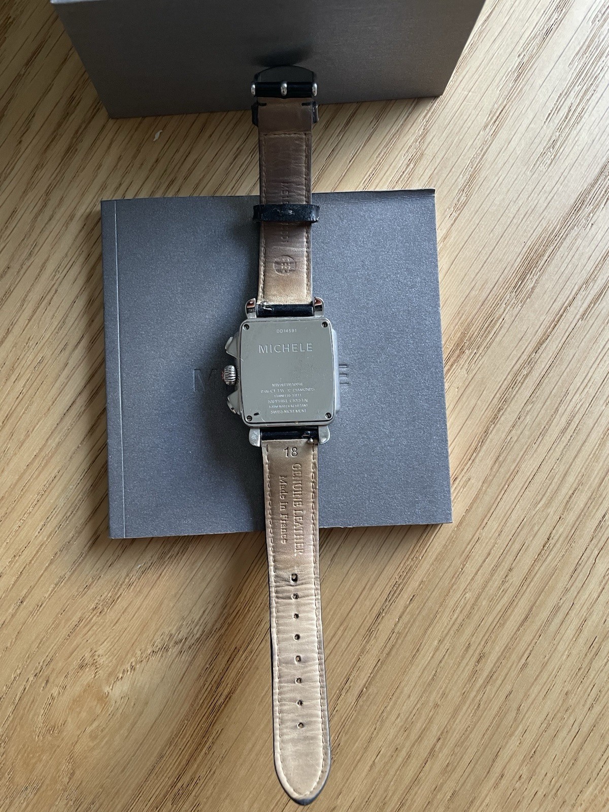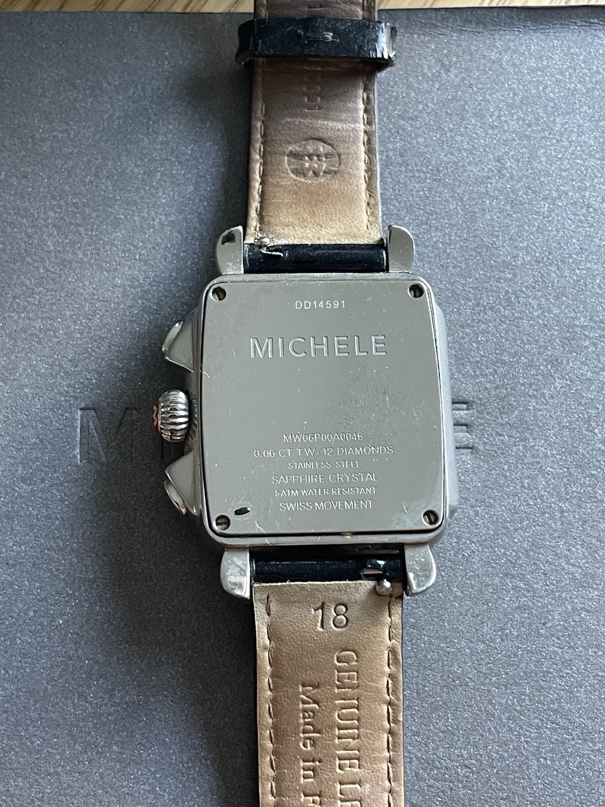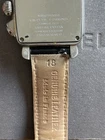 Michele Deco Chronograph Watch in Stainless Steel. This pre-owned watch is fully functional and features a sleek leather strap, Swiss precision movement, and an elegant design that blends sophistication and style. Original box and booklet are included. The stainless steel case shows minor hairline scratches typical of gentle wear, but no deep marks or dents. The leather strap shows some wear and creasing, consistent with use, but is still comfortable and secure.