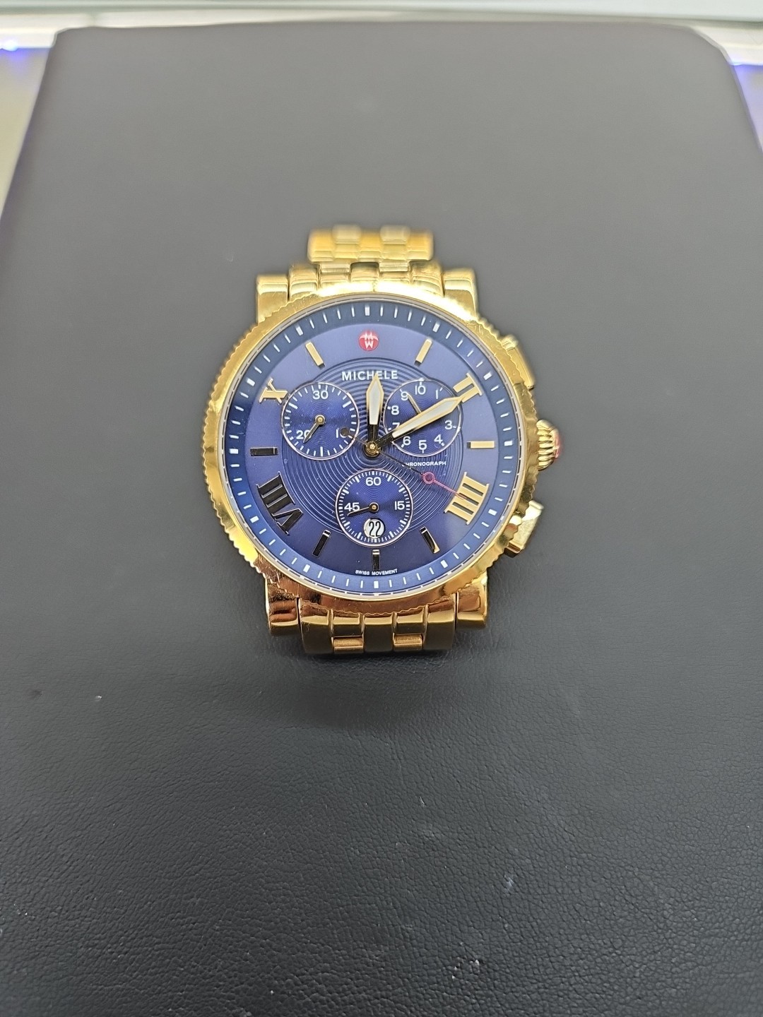 Band Material:Stainless SteelBrand:MICHELEBand Width:18 mmBand Color:GoldYear Manufactured:2010-2019Features:Water-ResistantDisplay:AnalogCustomized:NoIndices:Roman NumeralsType:WristwatchDepartment:WomenVintage:NoCase Finish:PolishedCase Color:GoldMovement:QuartzWater Resistance:50 m (5 ATM)Band/Strap:BraceletHandmade:NoDial Pattern:Mother of PearlCase Material:Stainless SteelWith Original Box/Packaging:YesCountry/Region of Manufacture:SwitzerlandWith Service Records:NoBezel Color:GoldHandedness:LeftBezel Type:Diamond