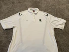 Elevate your game day attire with the Michigan State Spartans Polo Shirt. Designed for the ultimate fan, this white Nike Team Fit Dry polo is a staple for any supporter looking to combine style with comfort. Tailored to fit an XL, it's perfect for those who want to showcase their team pride without sacrificing a relaxed feel. Officially licensed by the NCAA, this polo is crafted to represent the Michigan State Spartans during the regular season and beyond. It's made in Indonesia, ensuring quality and durability, while the iconic Spartans branding makes it clear where your loyalties lie. Whether you're at the game or on the streets, this shirt is a consistent show of support for your favorite college football team. This item is preowned and shows signs of use and wear. Please see all photos for flaws and condition and please reach out with any further questions.