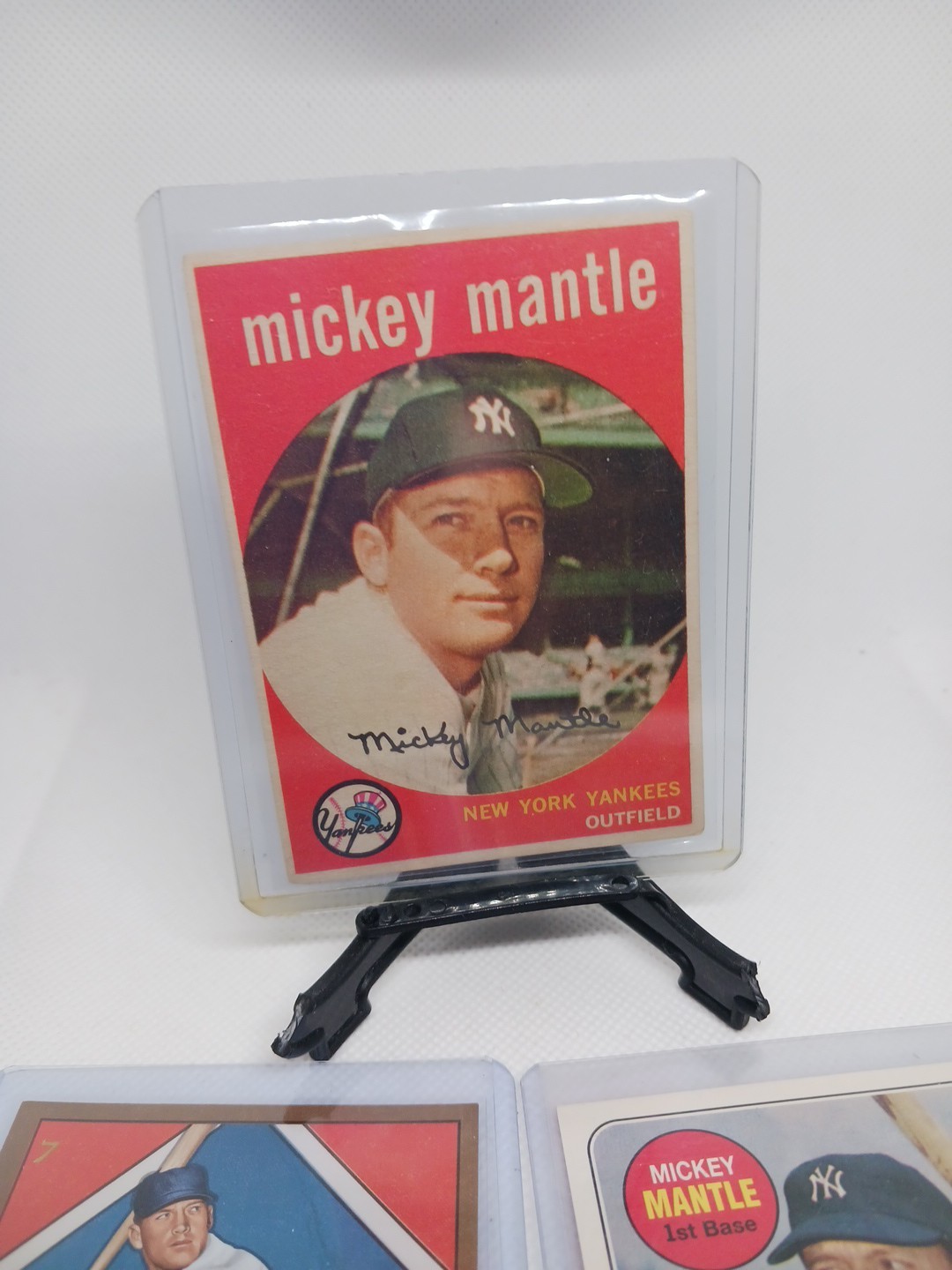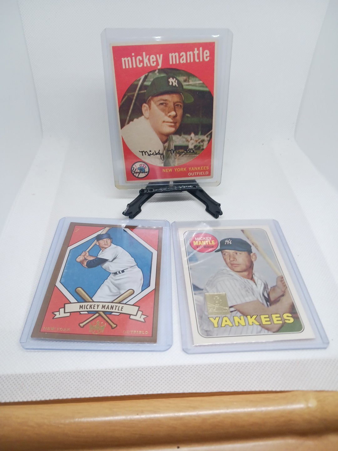This Mickey Mantle 3 Card Lot features a collection of 1996 Topps baseball trading cards along with a 2019 Panini card, all commemorating the legendary New York Yankees player. The cards are standard size and made of card stock, with a total of three cards included in the lot. These licensed reprints showcase exclusive insert features and are a perfect addition to any Major League Baseball fan's collection. With a focus on highlighting the career of Mickey Mantle, this lot offers a nostalgic look at one of the sport's iconic players. You will receive the three cards in the photograph