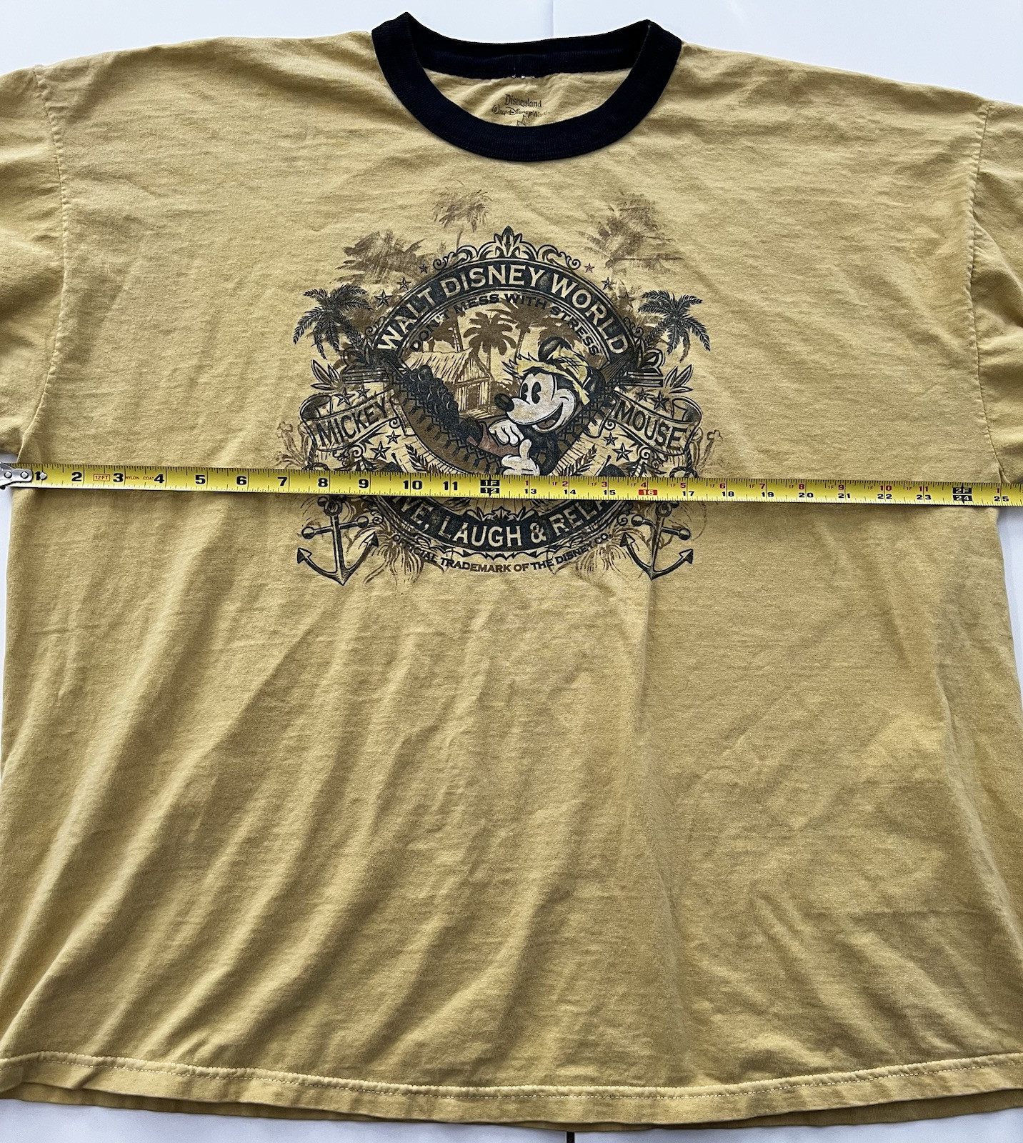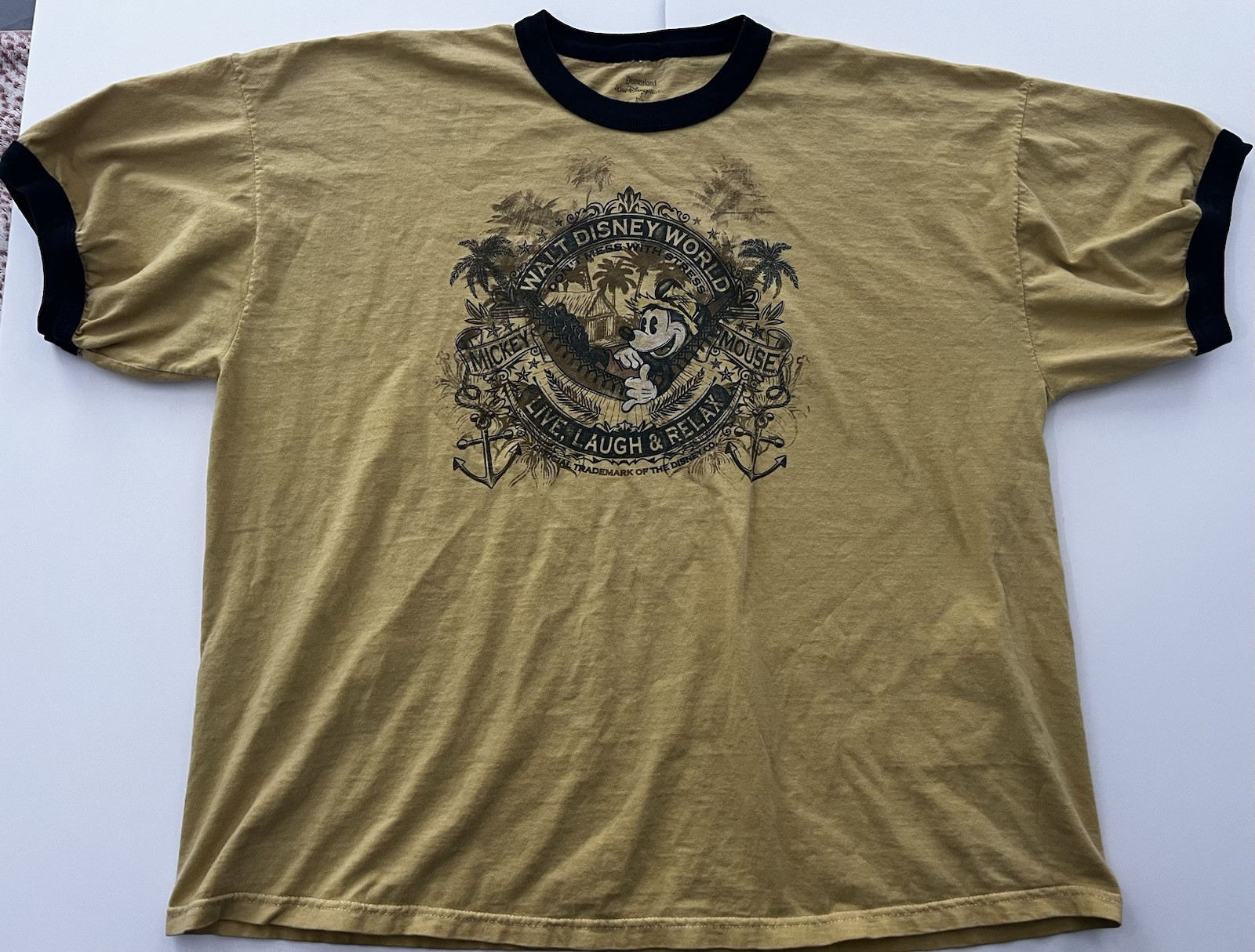 This is a Walt Disney World Mickey Mouse graphic tee for adults in size 2XL. The t-shirt features a solid yellow color with a relaxed fit and short sleeves, making it ideal for casual occasions. Made of cotton fabric, the shirt showcases the iconic character Mickey Mouse and the phrase "Live, Laugh & Relax" in a playful design. This unisex tee is part of the Disney character family collection, perfect for fans of Mickey Mouse and Disney.