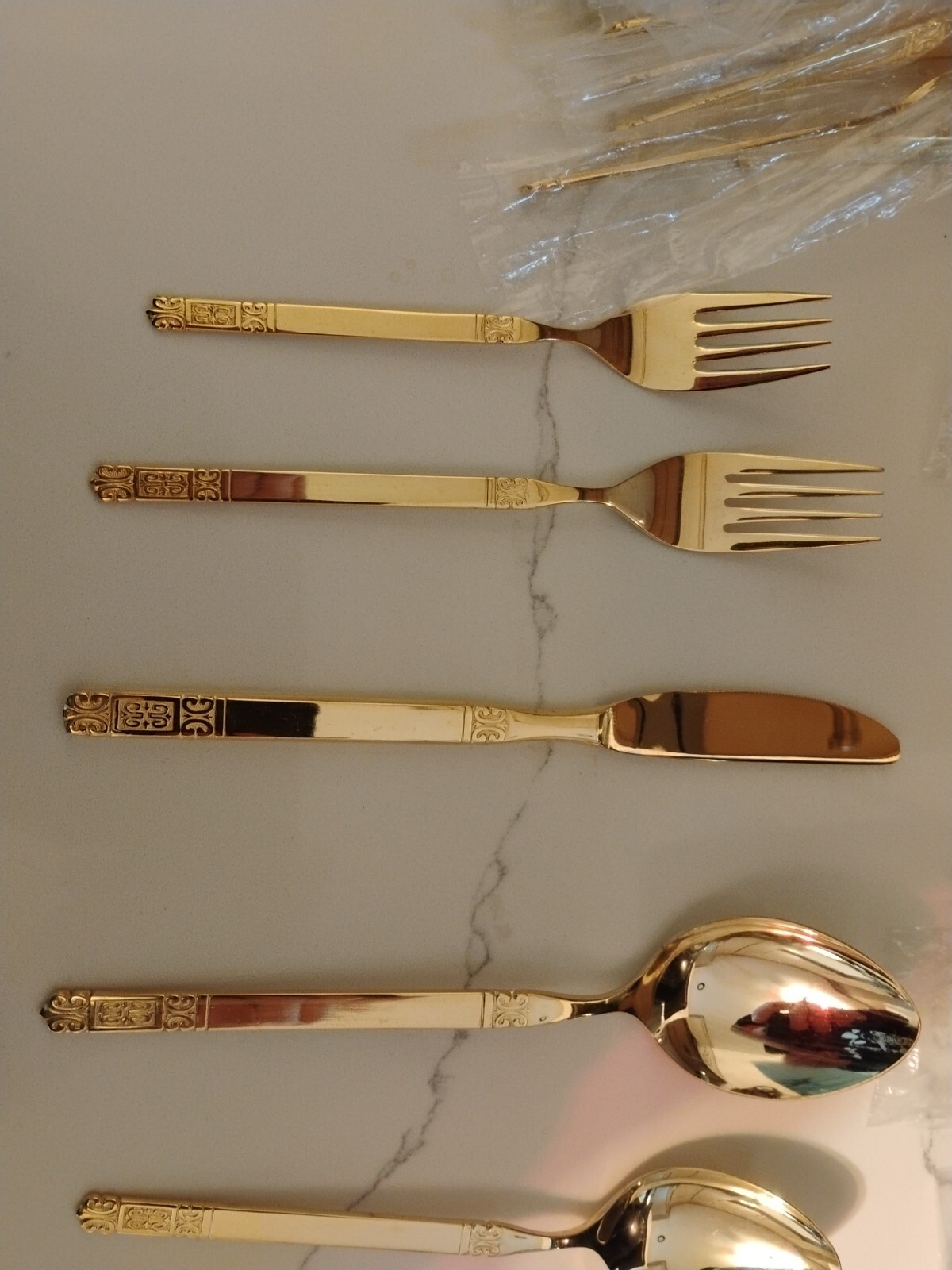 Here is an absolutely stunning 50 piece set. It's mid century Japanese 24k gold plated. Says " Continental" engraved on each piece. Along with Japan. The pattern is an extremely rare one, and be hard pressed to find the very same exact one. Never been used. I misplaced 2 of the ties when counting and showing them. Perfect time to show off this must have set for the holidays. Show off your good taste , as well as your knowledge quality. Please feel free to look at my current and future listings. More to come. Thank you. God Bless. No Reserve. Best offer
