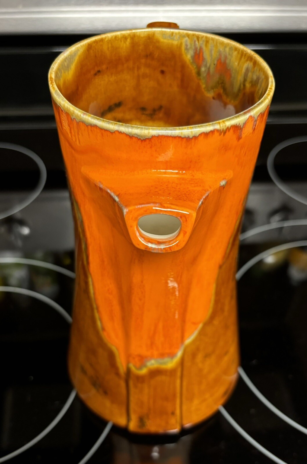 Elevate your home decor with this mid-century modern drip pitcher and pedestal mugs set. The brown and orange color combination, along with the footed pedestal design, adds a touch of vintage charm to any occasion. The glossy finish and art pottery production style make this set a unique and original addition to your collection. The unmarked brand and country of manufacture add to the mystery and allure of this set, while the three-footed pedestal mugs provide a sturdy and stylish way to enjoy your favorite beverage. Whether you're hosting a dinner party or enjoying a quiet evening at home, this ceramic set is sure to impress. Small chip on bottom of one of the mugs, see pictures. Pitcher is 9.25” high.