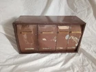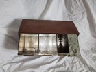 Mid Century Flour Sugar Coffee Tea Container Box Storage Metal Kreamer Ware USA. The measurements are 9" tall, 16 5/8" long, 6 1/4" wide. It could use a new paint job and decals, see photos. It has holes on back for mounting to the wall or it can sit on the countertop. Some surface rust on inside of containers, see photos. Wood handles are cute.