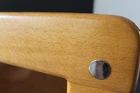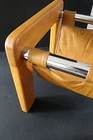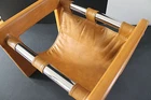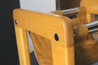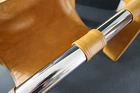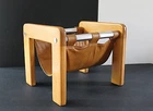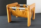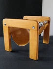 Perfect 70's! Offered is a vintage MOD magazine holder. Super design!! Heavy thick solid beech legs support an amazingly thick heavy duty 2" chromed steel tube with suspends a textured leatherette sling. Rich bold color.. the deep ochre brown plays beautifully off the chrome! Dimensions: 21"x19"x 17 1/2"...substantial weighing 20 lbs. In excellent vintage condition...some overall wear to the the sling (mostly loss of top stitching) (photo #9). The wood is gorgeous...beautifully finished. Bold. .. Mod Squad Chic! Smoke/pet free. Thank you for looking! Happy bidding. This will be disassembled for more economical shipping...easy two person assembly ( wrench will be included) We kindly accept payment no later than 2 days after close of auction