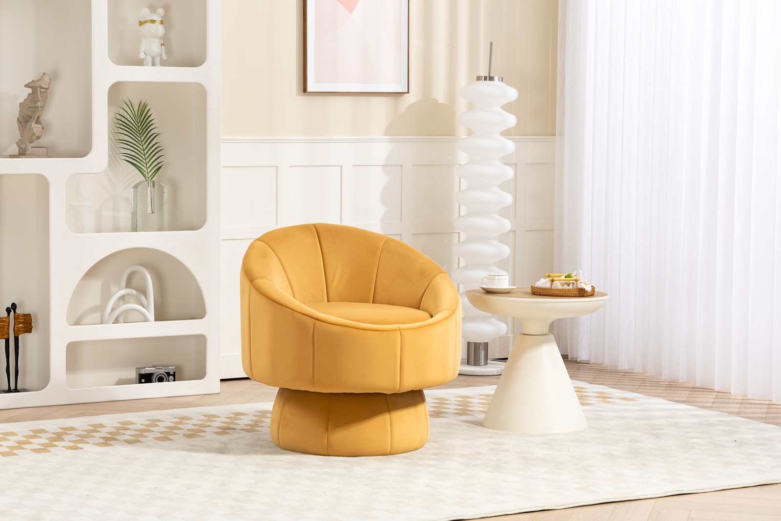 Specifications Place of Origin #originPlace# Main Color Dark yellow Main Material Velvet Filler Foam Product Style Modern Use Case Bedroom Dangerous Goods #dangerFlag# Dimensions & Weights Assembled Length (in.) 28.75 Assembled Width (in.) 28.75 Assembled Height (in.) 28.25 Weight (lbs) 34.39 Product Features Comfortable Seat & Backrest The seat and back are filled with high-density sponge, which is very soft to sit. Just imagine, after finishing tired day's work, And their max capacity can reach250lbs. All the parcels enclosed detailed installation instructions. Most of people can assemble it without extra tools, so do non-professional people.If you have any problems, pls feel free to contact us. Our this lounge chair chooses simple design in appearance. Natural wooden structure and pastel colour gives us a sense of peace and relax. Furthermore, classical design can meet the demands of most home decoration styles.. Description