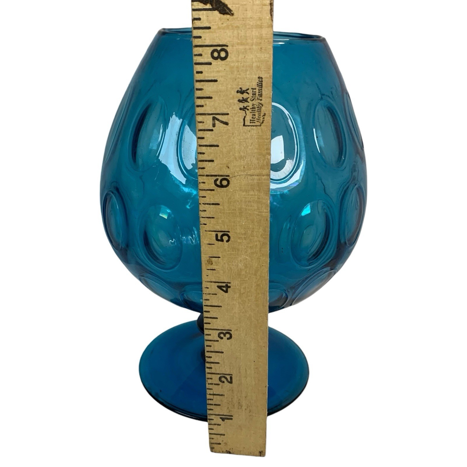 Mid-Century Blue Glass Empoli Style Thumbprint Pedestal Compote Vase 8” ⸻ Description: Make a bold, blue statement with this stunning mid-century modern pedestal compote vase! Featuring a rich teal blue hue with classic thumbprint (or coin dot) pattern, this piece brings that perfect pop of color to your vintage decor, whether you’re using it as a candy dish, planter, or centerpiece ready for its disco ball moment. • Stands approximately 8” tall • Beautiful Empoli-style design, likely Italian art glass • Rounded globe shape with flared footed base Condition: Pre-owned with light wear from display, no chips or cracks noted. A little vintage patina that says, “I’ve been fabulous for decades.” ⸻ Shipping: Calculated shipping with next business day handling.