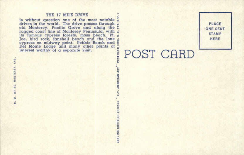 MAKE AN OFFER. THE MORE YOU BUY THE BETTER DEAL I WILL ACCEPT The postcard features an image of Midway Point on the 17 Mile Drive in Monterey Peninsula, California. The 17 Mile Drive is renowned as one of the most notable drives globally, passing through old Monterey, Pacific Grove, and along the rugged coast line of the peninsula.