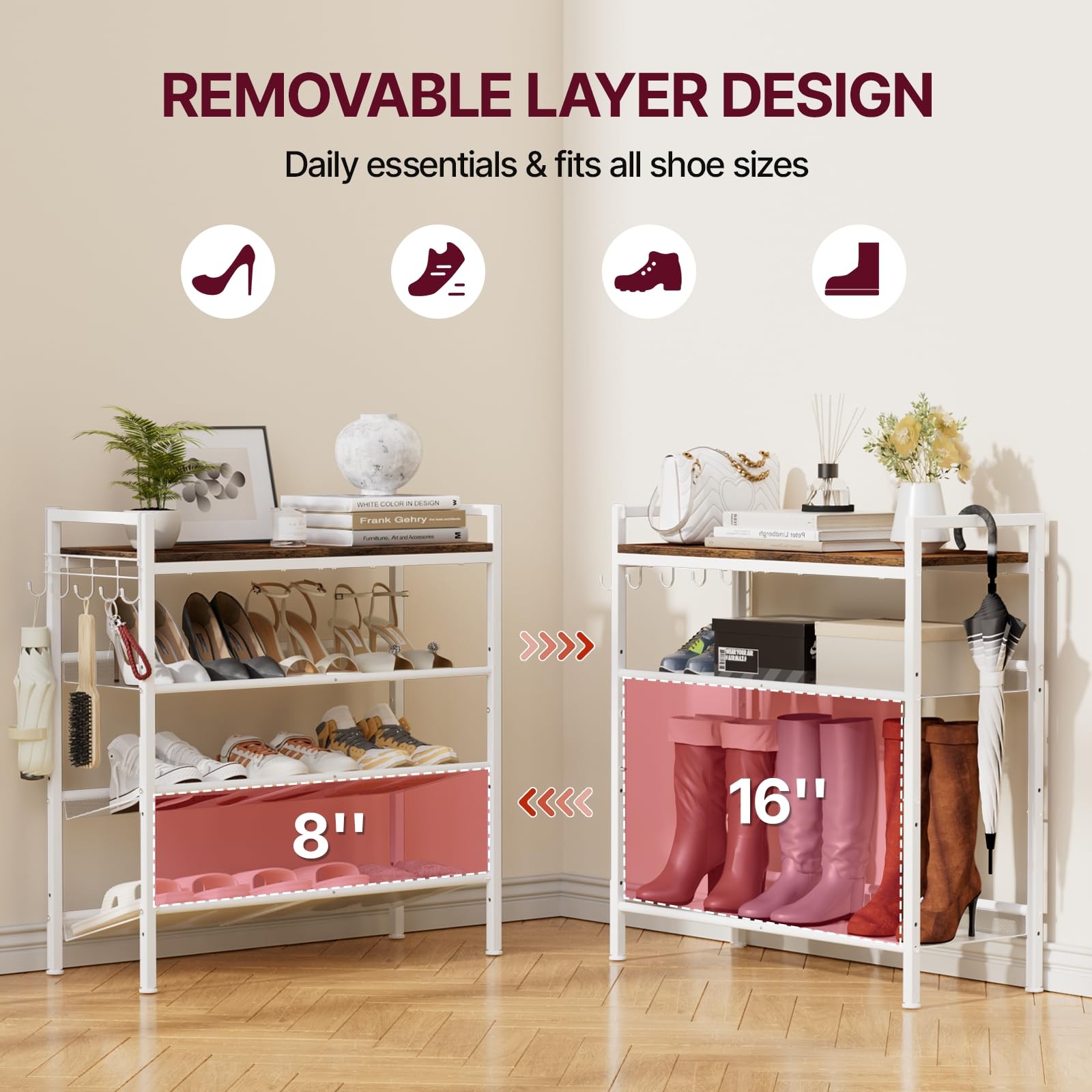 Shoe Rack for Front Door Entrance, Metal with Hook and Adjustable Mesh Shelves, Shoe Shelf Organizer for Entryway, Closet and Dorm Smart Tier Design: This 4-tier shoe rack is thoughtfully engineered to provide large-capacity shoe storage while maintaining a compact footprint. Holding 3–5 pairs per shelf, it accommodates 15–25 pairs of shoes in tota—ideal for families or sneaker lovers. Each level is spaced 8 inches apart to fit high heels, ankle boots, or sneakers with ease, shoe rack organizer helping you keep your entryway or closet neat and space-efficient! Efficient Shoe Storage Rack: The upgraded mesh shelves feature tighter spacing to prevent narrow heels from slipping through, while 4 tier shoe rack compartments easily fit everything from flats to boots. Shoe rack for entryway, closet, bedroom, or front door entrance, helps keep your space neat and organized, so that small shoe rack is the ultimate solution for a tidy, efficient home! Flexible Storage Needs: This adjustable metal shoe rack features customizable shelf height and tilt via pre-drilled side holes, making it easy to store anything from low-profile sneakers to boots. Designed for modern shoe storage and organization, white shoe rack it adapts effortlessly to suit various footwear types, it brings optimization to your home! Durable Wood & Metal Rack: This white shoe rack built with engineered wood panels and a durable iron frame. Each level provides stable shoe storage without sagging, whether used as shoe rack for front door entrance or as a metal shoe rack to hold heavy boots in the closet, its durable structure ensures reliable performance across a wide range of home environments—making it perfect for daily family use! Versatile Shoe Rack: This adjustable shoe rack is equipped with a convenient row of integrated hooks, perfect for hanging everyday items like keys, umbrellas, and handbag, 4-tier shoe rack for closet, ideal for busy entryway areas or tight front door spaces! Multi-Use Design & Simple Setup: This shoes rack blends function with flexibility, white shoe rack perfect for closet, entryway, front door, kitchens,bathrooms, in a narrow hallway, or by the garage for everyday footwear, while also serving as a minimalist shoe shelf for plants, towels, books, or daily essentials!