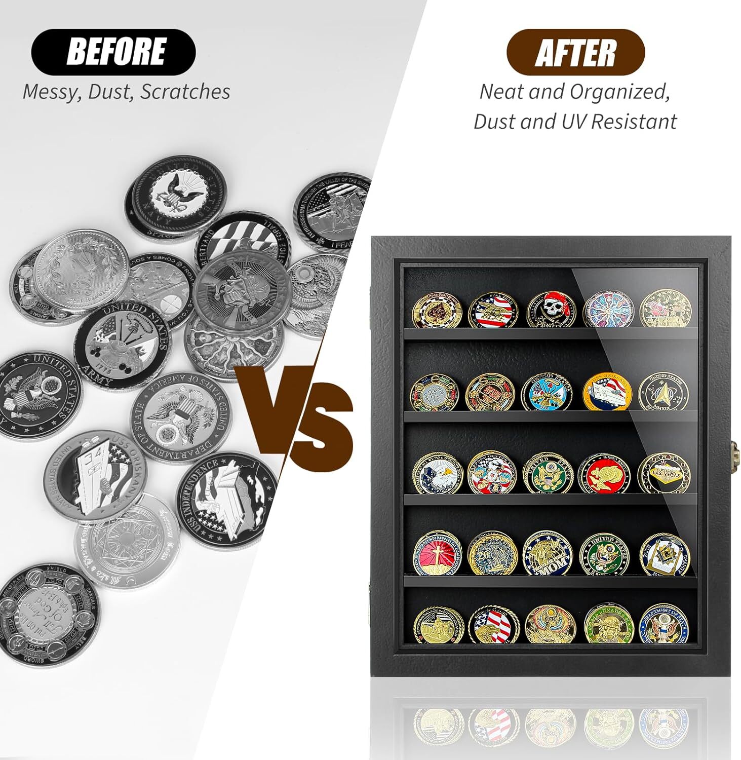 Coin Display Cabinet, Coin Collection Display Rack for Wall Mounted Military Medal Box Display Cabinet with Removable Double Recessed Shelves and Acrylic Panels - Black 80%wooden/20%acrylic PLEASE NOTE: The acrylic door is covered with peel-off protective film on both sides. Peel it off for transparency display, or leave it on for protection. Strong Protection: Our display box is built to last and easy to care for. Its matte black finish stays sharp, while the clear acrylic panel protects your collectibles from sunlight, keeping their colors vibrant. Flexible Display: Customize your showcase with four removable shelves, designed to securely hold coins of different sizes at an angle. This prevents slipping and ensures a neat presentation. Easy Wall Mounting: Hang it effortlessly with the included metal bracket, adding a touch of style to any space with its polished finish. Multi-Use Storage: Perfect for various collectibles like challenge coins, medals, sports coins, and badges. The acrylic panels keep your treasures looking fresh. Dedicated Customer Support: We're here to ensure your display case arrives safely and to assist with any questions or issues. Our team is dedicated to your satisfaction with our premium display solution.
