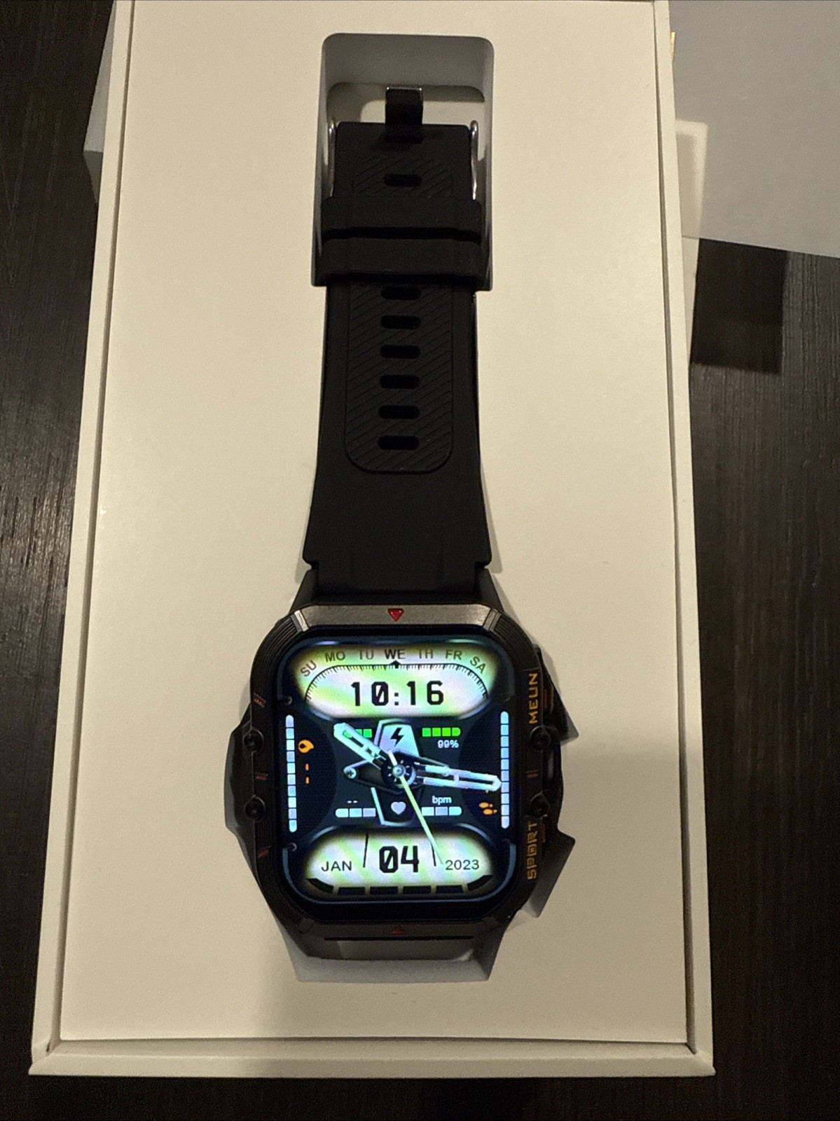 The Military Smartwatch with a 55mm black case and black silicone band is designed for men by the brand Blackview. This smartwatch features a range of functions such as a fitness tracker, touchscreen display, blood oxygen and pressure monitoring, sleep tracker, and more. It is waterproof and compatible with both iOS and Android operating systems. With a sleek aluminum case and 1GB storage capacity, this smartwatch is a versatile and reliable accessory for everyday use.