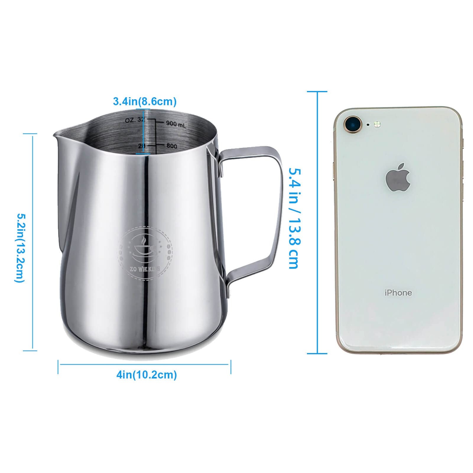 Elevate your coffee experience with our Premium Stainless Steel Milk Frothing Pitcher. Designed with both form and function in mind, this pitcher is perfect for baristas and coffee lovers who take their craft seriously. Whether you’re steaming milk for a cappuccino, frothing it for a latte, or simply pouring cream, this pitcher does it all with precision and style. Crafted from top-quality food-stainless steel, this frothing jug is built to last. Its durable, rust-resistant design ensures that it will withstand the test of time, even with daily use in a busy kitchen or coffee bar. The ergonomic handle provides a secure and comfortable grip, while the heat-resistant properties keep your hands safe during use. The precision spout is the star of the show, allowing you to create beautiful, intricate latte art with ease. Say goodbye to messy drips and spills – the spout is designed for smooth, controlled pouring, so you can focus on crafting the perfect cup. With a 20 oz capacity, this pitcher is just the right size for single servings, but if you need more, we offer larger sizes to suit your needs. And when it’s time to clean up, simply pop it in the dishwasher – the seamless design means no hard-to-reach spots for milk to hide. Whether you’re a seasoned barista or a home coffee enthusiast, our Premium Stainless Steel Milk Frothing Pitcher is an essential tool in your coffee-making arsenal. Order yours today and take your coffee creations to the next level! Specifications: Material: Food-stainless steel Capacity: 20 oz (also available in 12 oz and 32 oz) Dimensions: [Insert dimensions here] Weight: [Insert weight here] Finish: Mirror exterior, brushed interior Dishwasher Safe: Yes ☕【Fashion & Durable】 The milk frothing pitcher is made of high quality 304 stainless steel, strong and durable, exquisite workmanship.non-rust,anti-corrosion,unbreakable for daily use. Very easy to clean after use. ☕【Convenience & Accuracy】 This precise capacity of 32oz milk frother pitcher has engraved the liquid measurement on both sides, makes it easy to read, it is perfect for 3 or 4 cups of cappuccinos or espressos needs. ☕【Humanization Design】After many experiments, we made a unique narrow mouth design for this stainless steel milk frother pitcher, makes control liquid pouring speed and volume precisely,equipped with a latte art pen, can create a variety of beautiful patterns.Hand-held handle doesn't hot, it helps you concentrate on the latte art and no worry about getting hurt. ☕【wide application】The milk steaming pitcher can help you in a lot of ways, such as frothing or steaming milk cream for a latte, measure liquids, serve milk or cream. You can use it at home, office, cafe or hotel . The frothing pitcher also can be a nice gift for parties or festivals. ☕【Friendly & Professional】Hope you have a satisfying shopping experience from . If you have any questions about our product, please don’t hesitate to , we will try the best to solve the problem for you.