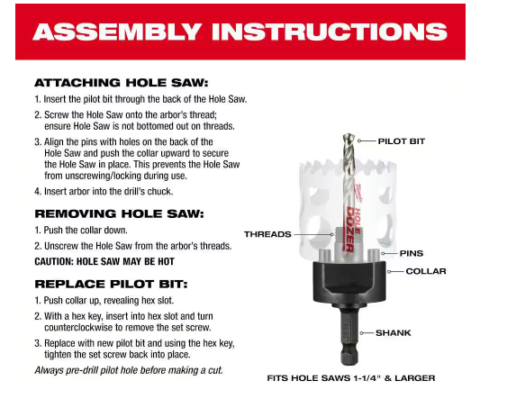 This arbor is a game-changer for quick hole saw swaps—smooth operation, solid grip, and no slipping. The large thread design makes changing bits effortless, and the bi-metal construction ensures durability. Perfect for pros and DIYers who need reliability and speed on the job. Milwaukee nailed it with this one!