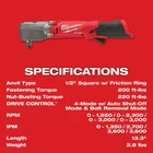 You may also like DEWALT DWE7491RS 10 in Jobsite Table Saw 32 1/2 in Rip Capacity & Rolling Stand 549.0 USD Free shipping Milwaukee 48-22-8442 PACKOUT 2 Drawer Durable Tool Box w/ 50lbs Capacity NEW US 156.0 USD Free shipping Milwaukee 49-16-2739 M18 FUEL 18V QUIK-LOK Cultivator Attachment NEW 249.0 USD Free shipping Milwaukee 48-22-8427 PACKOUT Rolling Tool Box w/ 250 lbs Weight Capacity NEW US 159.99 USD Free shipping Milwaukee 1/4-Inch 90-Degree Angle Offset Power Groove Drive Adapter 49-22-8510 53.95 USD Free shipping Klein Tools ET600 Insulation Resistance Tester - Megohmmeter NEW 169.99 USD Free shipping DEWALT ToughSystem Workshop Racking System Model DWST08260 Black New 111.0 USD Free shipping Milwaukee 48-22-8422 PACKOUT Heavy Duty Impact Resistant Compact Tool Box new 69.97 USD Free shipping Milwaukee 48-22-8432 PACKOUT Deep Organizer w/ 50 lb Weight Capacity NEW 64.97 USD Free shipping Dremel 4300-9/64 Variable Speed Rotary Tool Kit with Flex NEW US 199.0 USD Free shipping Features POWERSTATE Brushless Motor delivers up to 220 ft-lbs. of nut-busting torque, making it the most powerful cordless right angle impact wrench on the market A 2.2" head profile design allows for more access in tight spaces Mode 1 RPMs: 0-1,550; Mode 2 RPMs: 0-2,300; Mode 3 RPMs: 0-3,000; Mode 4 RPMs: 0-3,000 Mode 1 IPMs: 0-1,350; Mode 2 IPMs: 0-2,700; - Mode 3 IPMs: 0-3,600; Mode 4 IPMs: 0-3,600 Auto shut-off mode prevents over-tightening and increases productivity by applying no more than 15 ft-lbs. of torque. Bolt-removal mode offers more control after bolt breakaway as RPMs drastically slow down once the bolt is loosened. The long body profile of 14.17" allows for more access in hard to reach spaces REDLINK PLUS Intelligence ensures maximum performance and protects from overloads, heating and over-discharge LED light to illuminate the work area Premium rubber overmold withstands corrosive materials and provides increased comfort when in use Works in up to 69kV environments What's in The Box M12 FUEL 1/2" Right Angle Impact Wrench - 2565-20 (2) M12 REDLITHIUM CP2.0 Battery Pack - 48-11-2420 M12 Charger - 48-59-2401 Contractor Bag Owner's Manual Warranty 5 Year Limited Factory Warranty 30 Day Satisfaction Guaranteed Specifications SKU 2565-22 Brand Milwaukee Volts 12V Power Cordless Brushless Yes Drive Size 1/2 in No Load Speed 1350/2700/3600 Max Torque 220 ft-lbs Drive Control Modes 4 Length 13.2 in Width 2.3 in Height 2.9 in Weight 2.8 lbs