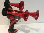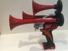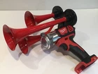 Milwaukee M18 Cordless Handheld and Very Loud ,Variable Tone, Air Horn - Train Horn. Comes w/Billet Finish Compressor & 3 Red Trumpets, Longes One is 11 Inches . Excellent Balanced Horn w/Stainless Steel Mounting Hardware and Working LED Light. May Include Clear, Red or Black Air Hose > Preferred hose color can be noted on checkout < Battery Not Included ! Trumpets may be RemovedUnscrewed) for Easier Siping & Handeling ! Compatible w/All M18 Batteries. In Mint Condition. Fast Shipping. Thanks for Your interest and God bless.