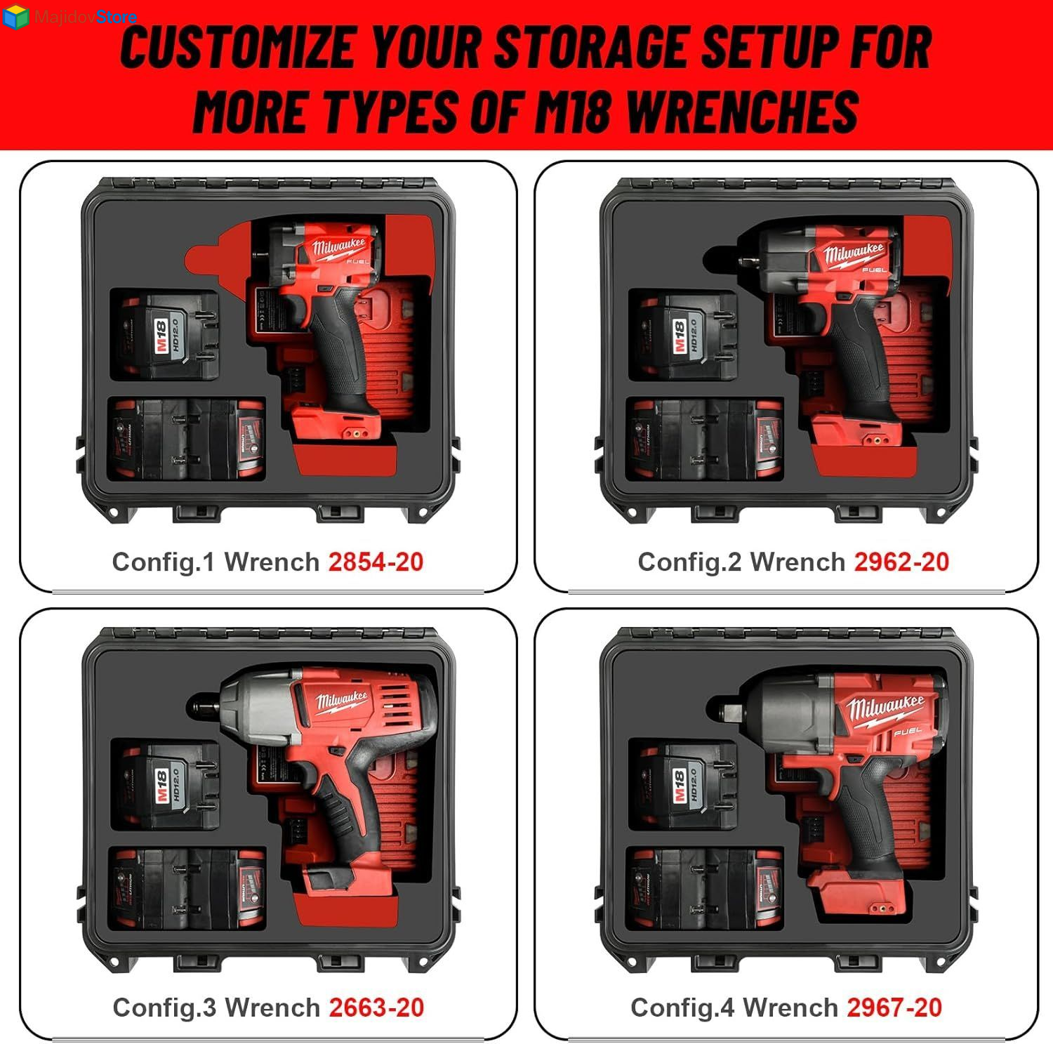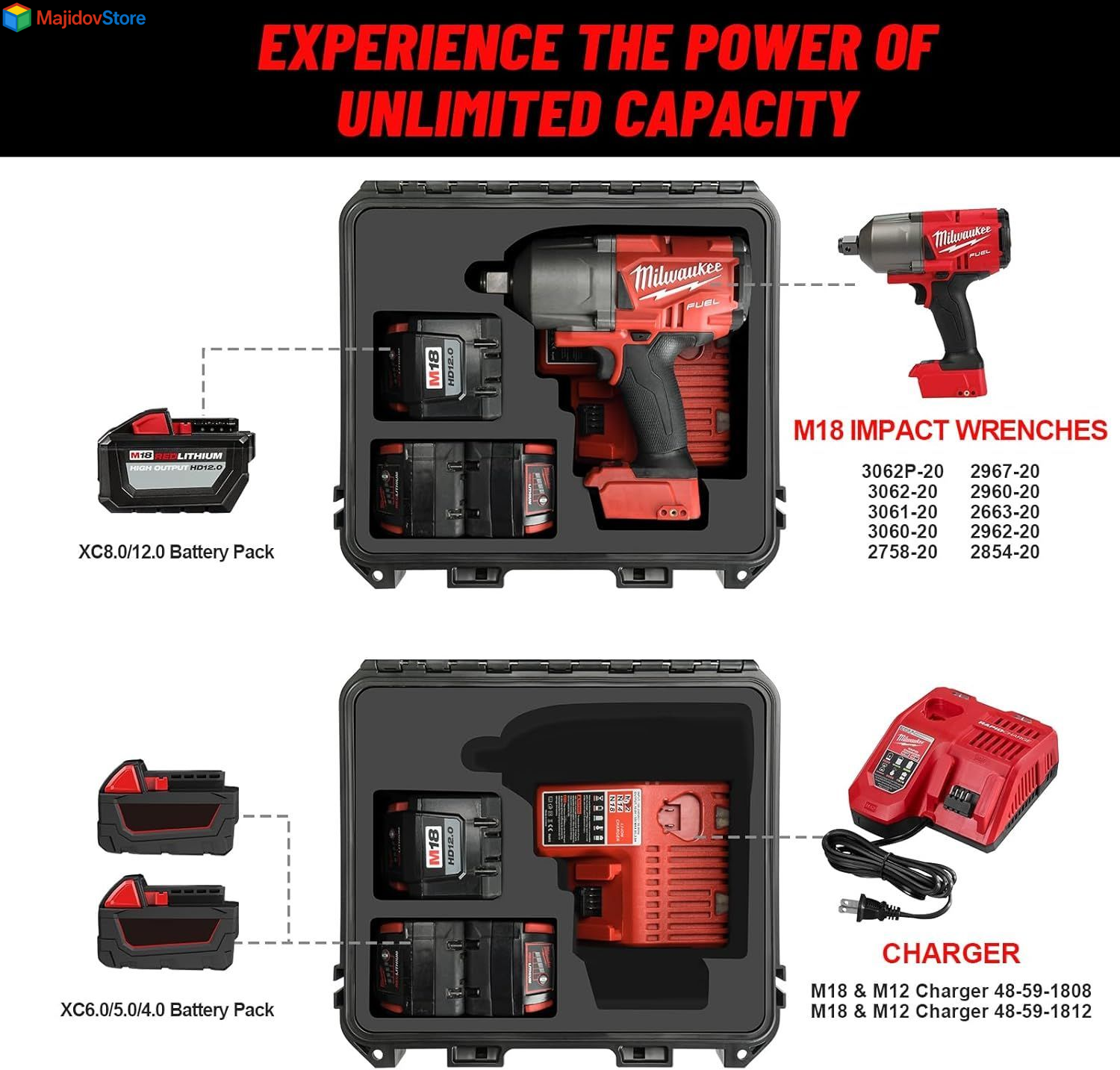 Case for Milwaukee M18 Impact and Torque Wrench - Waterproof Large Capacity Description Features: : . & , . [Hard Case for Milwaukee M18 Wrench & Battery & Charger] : For Milwaukee tools case is designed for Milwaukee M18 Impact Wrench: 3062-20,3061-20,3060-20,2758-20,2967-20,2960-20,2663-20,2962-20,2854-20,2855-20,2855P-20,2766-20,2767-20,2666-20,2666-21B,2659-20,2658-20,2759-20,2759B-20,2863-20,2862-20,2864-20,2962P-20; XC12.0/10.0/8.0/6.0/5.0/4.0/3.0/2.0/1.5 Battery Pack; Chager: for M18 & M12 Charger 48-59-1808,M18 & M12 Charger 48-59-1812. [Sturdy Carrying Design for Milwaukee M18]: This hard case is designed with a durable and secure lock latch system, ensuring safely for Milwaukee tools. The comfortable and stable handle makes it convenient to carry your tools to job sites. [Versatile Application Case]: Whether you're a professional contractor, electrician, or a DIY enthusiast, this hard case is designed to meet your needs. It's ideal for transporting and storing for Milwaukee wrench, batteries, and chargers on busy job sites, in workshops, or during home renovation projects. The case's durable construction and secure lock latch make it perfect for protecting your tools during travel, ensuring they are ready for use in any setting. [High-Quality Material Case for Milwaukee]: Constructed from durable polypropylene, this hard case offers excellent protection against impacts, dust, and moisture. The rugged PP material ensures for Milwaukee tools remain safe and secure, providing long-lasting performance in any environment. [Large capacity for Milwaukee]: Case is your perfect storage solution! The carefully designed box provides spacious interior space that can accommodate various M18 wrench, batteries, and chargers. Its sturdy and durable material ensures the safety of your items, whether in harsh rain, muddy construction sites, or during travel. This case will bring a relaxed and convenient experience to your life! Product Details: Manufacturer: LOTOCASE Item Weight: 5.39 pounds Package Dimensions: 14.53 x 13.23 x 7.17 inches Country of Origin: China Item model number: MIW-banshou-M18 Color: Large Capacity Voltage: 18 Volts (DC) Included Components: Storage Hard Case Batteries Included?: No Batteries Required?: No Battery Cell Type: Lithium Ion Brand: LOTOCASE Voltage: 18 Volts (DC) Battery Cell Composition: Lithium Ion Included Components: Storage Hard Case Handling We will ship all orders within 2 business day of payment. Delivery We Do Not Ship Outside of the Continental US. Return Policy All items qualify for returns within 30 days of receipt. Buyer is responsible for return shipping on any item that is not damaged. Feedback We take our reputation seriously, we buy and sell online, so we understand the value of trust. If you are unsatisfied with your order, please contact us and we will work with you to resolve it to your satisfaction.