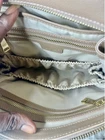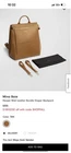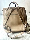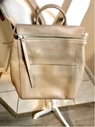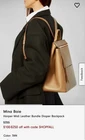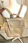 Mina Baie "Harper" Mini Tan leather diaper backpack Loop top handle Adjustable shoulder straps Three exterior pockets Ten interior pockets D-rings for stroller hook attachments Approx. 10.75"W x 7.25"D x 13.75"T Item Weight (Lbs.): 2.3 Lining: Nylon Wipe clean Trim: Leather Imported Missing dust bag
