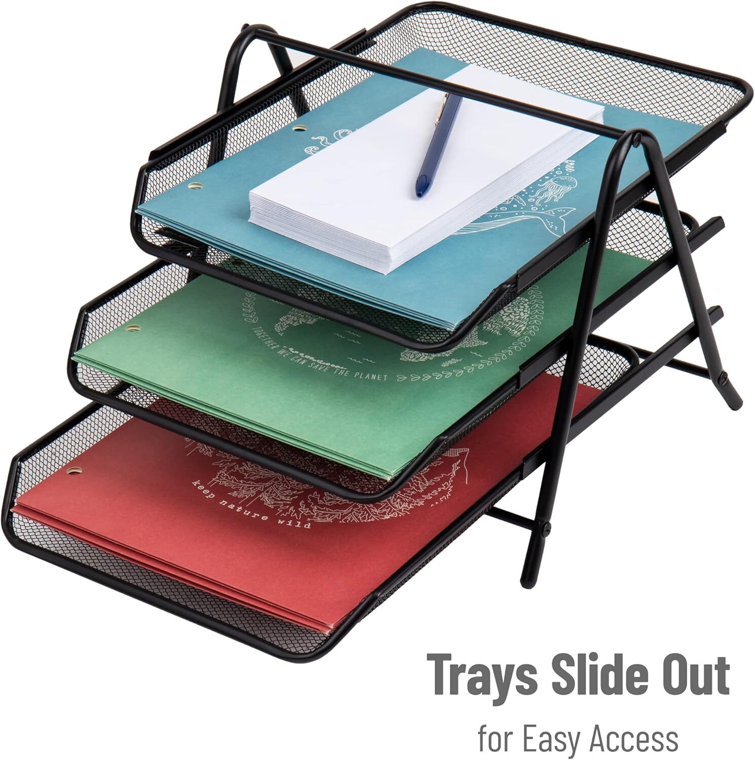 Mind Reader 3-Tier Paper Tray, Desktop Organizer, File Storage, 1 Pack, Black Product Details Brand: Mind Reader Color: Black Material: Metal Product Dimensions: 13.75"L x 11.5"W x 10.25"H Shape: Rectangular Space-Saving Multi-Tiered Design: Opt for vertical storage with four roomy slide-out trays, perfect for files, mail, documents, folders, bills, and letters, decluttering your desk or counter Stable and Non-Slip: Equipped with rubber feet for secure placement, easily slide trays out without the organizer shifting, while also protecting surfaces from scratches Easy Portability: Transport the 3-tray organizer effortlessly using the convenient carrying handle, making it perfect for any workspace Universal Versatility: Ideal for college dorms, offices, homes, schools, conference rooms, businesses, hotels, or any location where organized space is needed Perfect Dimensions: At 11.75 wide x 13.75 long x 10 inches tall (29.85 x 34.92 x 25.4 centimeters) this 3-tray desk organizer accommodates standard-sized documents with ease Conquer Clutter with a Versatile Organizer Maximize every inch of your work-from-home space, cubicle, or college dorm with a multifunctional paper tray organizer. Perfect for organizing your desk, storing makeup tools and accessories, arranging kitchen supplies like sandwich bags and foil, or sorting monthly bills and paychecks. Easily assemble your desk organizer using a screwdriver, taking care to align the holes for inserting screws to ensure a level, stable, and wobble-free organizer. The stylish and robust design features metal mesh construction within a sturdy frame. Maintain its cleanliness with regular dusting or by wiping it down with a clean cloth. Surprise a friend or family member with this versatile organizer as a gift. It's ideal for those who love organizing recipes, curating favorite magazine articles, engaging in crafting or scrapbooking, or need assistance in tidying up a home office, desk, shelf, or cluttered dorm room.
