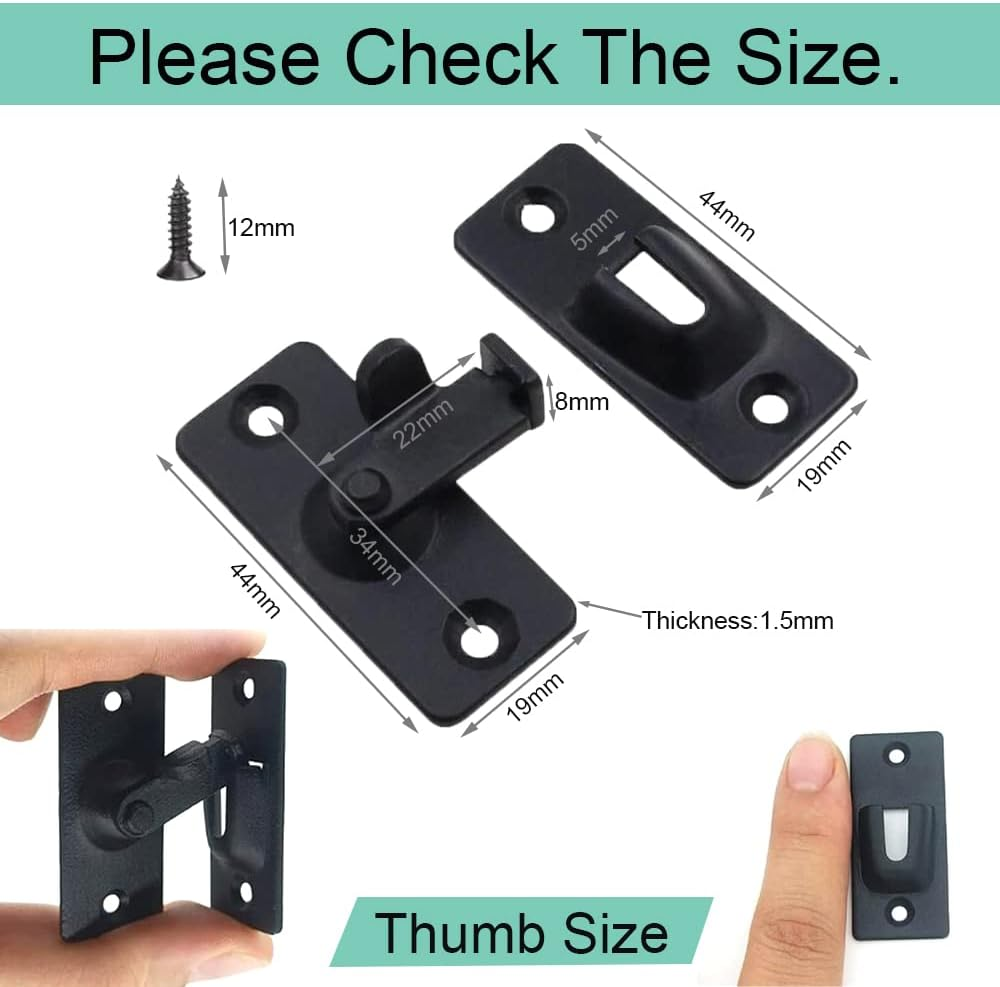 High-Quality Materials: Our 90 degree door buckle made of 304 stainless steel, one-piece molding, premium coating on the surface. High strength, no rust, no discoloration, guaranteed service life and reliability. Excellent Design:Toggle design, simple and practical. The counterbore design allows the screw head to be flush with the latch surface, which means that when you flip the lever, the screw head will not interfere.The thickened base is not easy to be broken and deformed, and it is strong and durable. Application on Both Sides: Our pocket door locks suitable for left and right applications. Contains screws, easy to install. Multi-Purpose: Theses sliding door locks very suitable for wooden doors close to the wall. Very suitable for doors and windows that open from the inside. Such as bathrooms, toilets, fitting rooms, dressing rooms, bedrooms, barn doors, sliding doors, sliding windows, etc., can also be used for baby doors or pet doors. Tiny Size: Our designers deliberately designed this clasp lock as a mini size, which is convenient for installation in a tight space. Please check the size before buying. Product Description ●This is a keyless lock, ideal for doors and windows that open from the inside. Suitable for left and right applications. ●MINI SIZE: you can use it for bathroom, toilet, fitting room, dressing room, bedroom, sliding door, sliding window, etc. It can also be used for baby door or pet door. ●As a reminder: this door latch can only resist low violence and is not suitable for doors with high security requirements such as gates. Matte black, fits any style you have. One-piece molding, multi-layer polishing treatment on the surface,highlighting the texture. Upgrade size, More choices