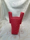This is a mini top handle bag in hot pink, made of acrylic beads. It has a solid pattern and a pink handle/strap made of acrylic beads. The bag has a compact size with dimensions of 2 1/4 inches in width, 5 inches in height, and 6 inches in depth. It features a pink exterior. This stylish and vibrant bag is suitable for unisex adults.