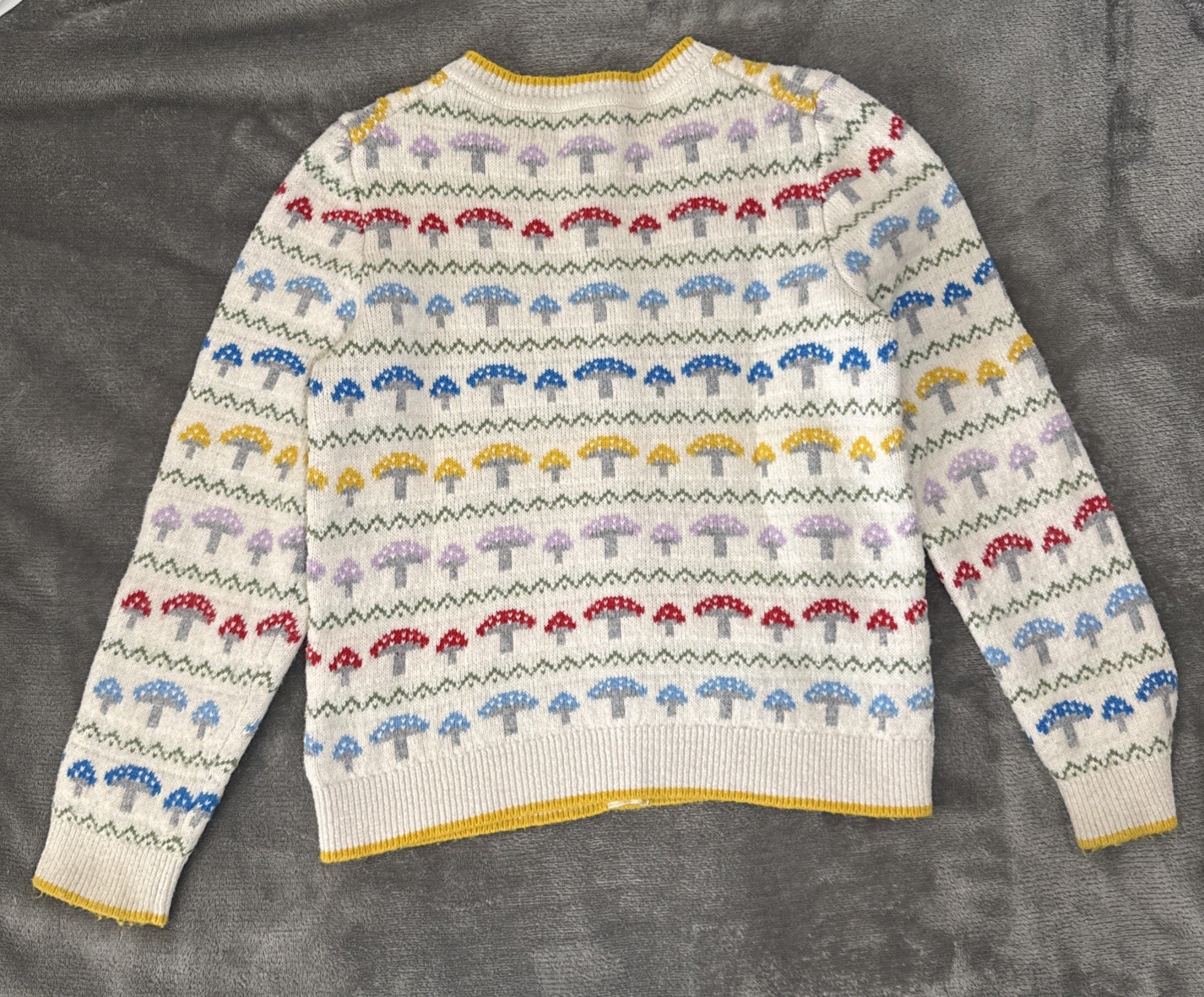 Adorable Mini Boden Edie Toadstool Fair Isle Cardigan featuring a whimsical toadstool pattern on a classic Fair Isle knit. Perfect for layering during cooler weather—both cozy and stylish. Details: * Size: 7–8 Years * Front button closure * Soft knit with a hint of wool * 57% cotton, 31% polyamide, 12% wool * Imported * Item #10463632 Condition: Excellent pre-owned condition. Always dry cleaned only, never washed.