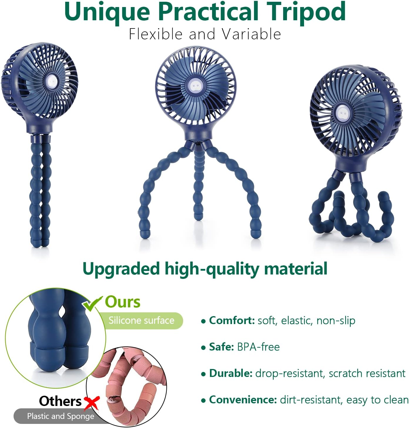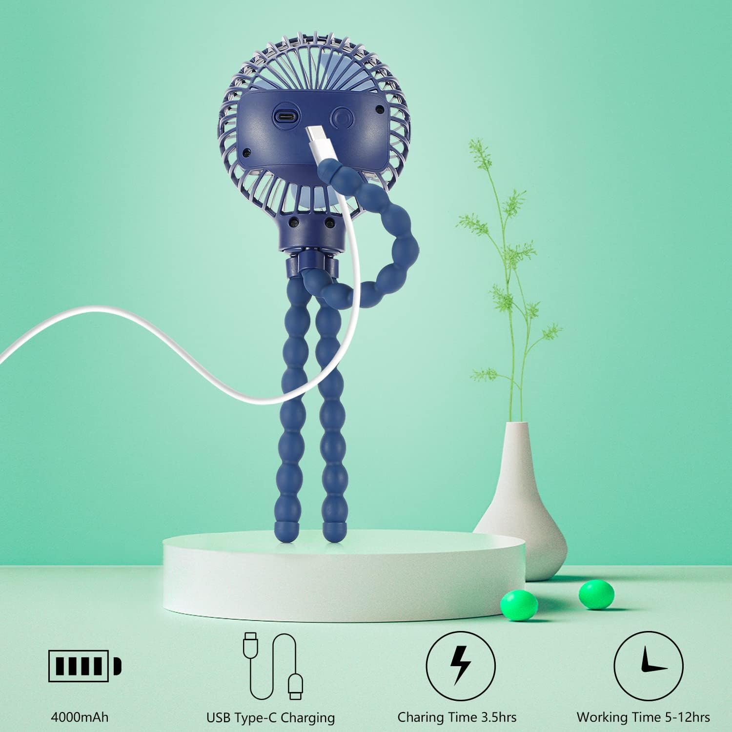 Mini Handheld Personal Portable Fan, Baby Stroller Fan, Car Seat USB or Battery Powered, with Flexible Tripod Clip on Student Bed Desk Bike Crib Treadmill Camping Traveling(Navy Blue) 【Upgraded Flexible Unbreakable Tripod】snawowo baby stroller fan has an upgraded tripod which is made of high quality bendable metal and food grade silicone surface instead of the old plastic and sponge surface. so you don't have to worry about the baby eating it by mistake. The tripod is waterproof, not easy to get dirty and broken, easy to clean, and more anti-wear. 【Strong Wind & Low Noise】This mini stroller fan built-in brushless motor, which is powerful and has a long service life. One-button operation for switching 3 wind speeds. The low noise motor is suitable for your quiet office or reading, and suitable for your baby to sleep comfortably. 【USB or Rechargeable Battery Operated】This portable stroller fan is powered by USB or Battery using Type-C interface. It can be charged by computer, laptop, power bank, car charger etc. The build-in rechargeable battery has real 4000mAh, not fake capacity. 3.5hours for full recharge, 5~12 hours working time depends on speed. 【Versatile and Portable】Our rechargeable portable fan is small enough to take with you anywhere. It is convenient for bedrooms, desktops, strollers, camping, car seat, crib, treadmill, and travel. 【Ideal Summer Gift】Cute octopus fan that you and your kids will love, so it will be an ideal gift for your friends and family. If you are not completely satisfied, please feel free to contact us and we will provide you with a satisfactory after-sales warranty service. Product description Using SNAWOWO upgraded baby stroller fan to give you, your baby, your family and friends a cool summer! Based on a lot of user experience and feedback, our fans have been upgraded from the inside out: All-silicon and integrated molding tripod The new tripod uses new materials and manufacturing processes. It is soft, non-slip, so comfortable for you to handhold. It is waterproof and easy to clean, so convenience to use and health to your baby. It is hard to be broken, so durable to use for many years. Dense outer cover with gaps less than 6mm The denser gaps on the fan housing can prevent the baby's fingers or toes from entering the fan and getting injured. So it is safe for children. You can let your baby use it safely without any worries. 4000mAh rechargable battery The built-in battery has a larger capacity. It will work 5~12 hours depend on speed after about 3.5 hours fully charging. Type-C USB interface for easy charging, can be charged by computer, laptop , power bank, car charger etc. The flexible tripod can be bent at any angle, so you can use it in any scene as you like: Handheld Straighten the stand mounts to be a grip handle, it can be used as a handheld fan. It is portable with small size and light weight, so it can be easily put in a shoulder bag, carried with you and used at any time. Standing This mini fan can stand on your desk stablely as a desk fan. It's height and angle can be adjusted according to your needs. Provide a comfortable and cooling environment to you, when you are working or gaming on a hot day. Winding Use your imagination, this fan can be tied or hung on any objects with sticks, such as stroller, crib, car seat, bicycles, parasols, treadmill, bike, etc., when you need it, give you a cool experience immediately. Meet all your needs: handheld style for outdoors, standing style for desk, winding style for baby stroller, cribe, car seat, even a phone holder. Specifications: Input: DC5V 0.8A(MAX) Power consumption: 3W Battery capacity: 4000mAh Charging duration: 3.5hours Working time: 5-12hours Size: 11*4.3*3.2inches Weight: 320g (0.70lb) Package list: 1 * Stroller Fan 1 * USB Charging Cable 1 * User Manual Why SNAWOWO Stroller Fan stands out? New upgraded flexible tripod design All silicon and integrated molding tripod Dense outer cover, safe for baby Real 4000mAh built-in rechargeable battery Adjustable 3 speeds Equips brushless motor, strong airflow but ultra quiet Handheld, standing or winding, meet all your needs Portable size to carry easily Warm Tips: 1. Please turn off the battery fan and take out the battery if you do not use for a long time. 2. Do not place this product in high humidity and high temperature. 3. Children to be used under the guidance of a guardian. Item model number H6+ Style Classic Power Source Battery Powered Noise Level 20 Decibels Control Method Touch Motor Type brushless Main Power Connector Type USB Number of Power Levels 3 Installation Type Portable Product Dimensions 4.76"D x 3.5"W x 7.83"H Efficiency High Efficiency Model Name H6+ Finish Type Smooth, Seamless Number of Blades 3 Reusability Rechargeable Indoor/Outdoor Usage Indoor, Outdoor Manufacture Year 2024 Room Type Bathroom, Bedroom, Dining Room, Home Office, Kids Room, Kitchen, Living Room, Nursery Item Weight 11.3 ounces Blade Length 3.2 Inches Special Feature 4000mAh rechargeable battery, Portable and lightweight, Unbreakable waterproof silicone legs Electric fan design Table Fan Mounting Type Clip On,Portable,Handheld,Desktop,Hanging Color C-NavyBlue Form Factor Versatile and Portable Wattage 3 watts Is Cordless? Yes Voltage 5 Volts Recommended Uses For Product Cooling Included Components Charging cable Switch Type Push Button Shipping Fast shipping is very important for us. Our standard US shipping service is FREE. Your order will be shipped within 2-3 business days upon full payment received. Your order will be delivered within 2-3 business days after the handling time. We only ship to the confirmed PayPal address. We reserve the right to cancel any order for any reason at any time. We are not responsible for undeliverable addresses. Returns and payment We offer a 30 days return policy from checkout winning date. We allow only PayPal as payment method FeedBack Your feedback very important to us, after you get your package an