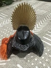 Miniature Japanese Samurai Helmet Kabuto Replica – Cast Iron w/ Brass Crest & Tassels Set of 3 miniature Japanese kabuto (samurai helmets), made from cast iron with decorative brass crests (maedate) and traditional orange tassels. Each helmet features unique detailing inspired by iconic samurai armor. These pieces are commonly used as display items, paperweights, or collectible decor, especially during Kodomo no Hi (Children’s Day) in Japan. Details: • Material: Cast iron (body), brass (crest), synthetic tassels • Origin: Japan (likely 20th century) • Function: Decorative, collectible, or paperweight • Quantity: Sold individually or as a set • Approx. Size: 3” wide × 3–4” tall • Weight: Hefty; each piece is solid metal