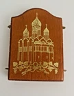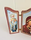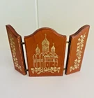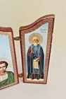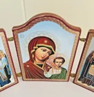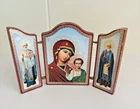 This mini Russian wood triptych with metal hinges features icon-style images of the Madonna & Child Jesus flanked by two saints. It measures approximately 3-1/4" tall by about 2-3/8" across when closed and 5-1/8" across when fully extended. It is in overall good used condition with only some very minimal wear to the exterior edges. A beautiful religious devotional ready for display. Feel free to reach out with any questions. I take great care when packaging and ship within one day of purchase. Thank you so much for stopping by! **Please understand this is a vintage and/or used item that may show wear due to age and use. This could include fading, scuffs, scratches, cracks, chips, crazing, marks, nicks, paint/detail loss, etc. Please review all photos before purchasing. All items are sold AS IS.**