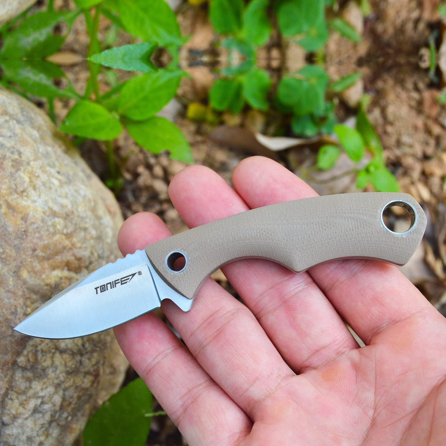 Blade Thickness: 0.126";Overall length: 4.68";Blade Length: 1.69";Weight: 1.23oz Small knife with kydex sheath can fit easily in pocket. Ball chain can make it as a neckace knife. Full tang fixed blade knife:The blade is made of 8Cr14MoV steel, can be qualified to various work tasks for outdoor use. Lightweight EDC knife: Compact utility and easy to carry. Little knife with G10 handle which is design for ergonomics grip, moistureproof, non-slip with reliable grip and wear resistance. Product Description Structure Introduction Blade Length: 43mm Overall Length: 119mm Weight: 51g Blade Steel: 8Cr14MoV Handle: G10 Style: Fixed Blade Knife with Sheath Sheath Material: Kydex TONIFE Squirrel Full Tang Neck Knife This is an outdoor knife that can be used as a camping knife, hiking knife, rescue knife, carving knife, fishing knife, and can also be used for daily use. The design of the sheath can better protect the blade and keep the blade sharp. This fixed blade knife also comes with a bead chain, which can be hung around the neck daily, which is very convenient to carry. The full tang structure not only makes the outdoor sports knife stronger, but also increases durability and balance, which is very suitable for camping and various outdoor activities. Knife blade Fixed full-tang knife: The blade is made of 8Cr14MoV steel, which is durable, not easy to break, not easy to rust, and can be used for various outdoor work. Handle G10 handle pocket knife: The handle is made of high temperature resistant and corrosion resistant G10 material, which is ergonomic, can be held for a long time without fatigue, and is highly comfortable when used. Knife sheath Fixed blade knife with sheath: The combination of sheath and bead chain not only protects the blade, but also allows the bead chain to be hung around the neck when necessary and used as a neck knife. It is the best partner for outdoor activities. Parameter Blade Steel 8Cr14MoV Blade Length 1.69" Overall Length 4.68" Handle G10 Weight 1.23oz Color Black /Orange /Warm Sand /Green